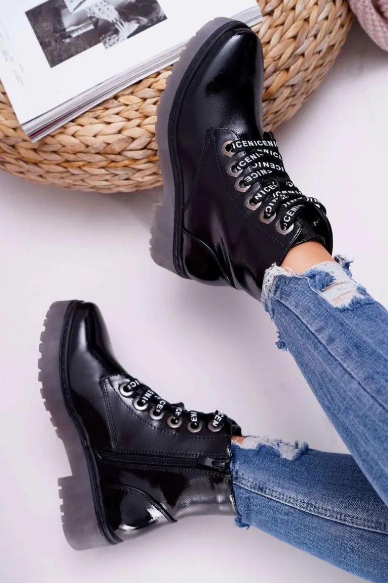 Botki Damskie Płaski Obcas Glany Lakierowane Czarne Sergio Leone TR726