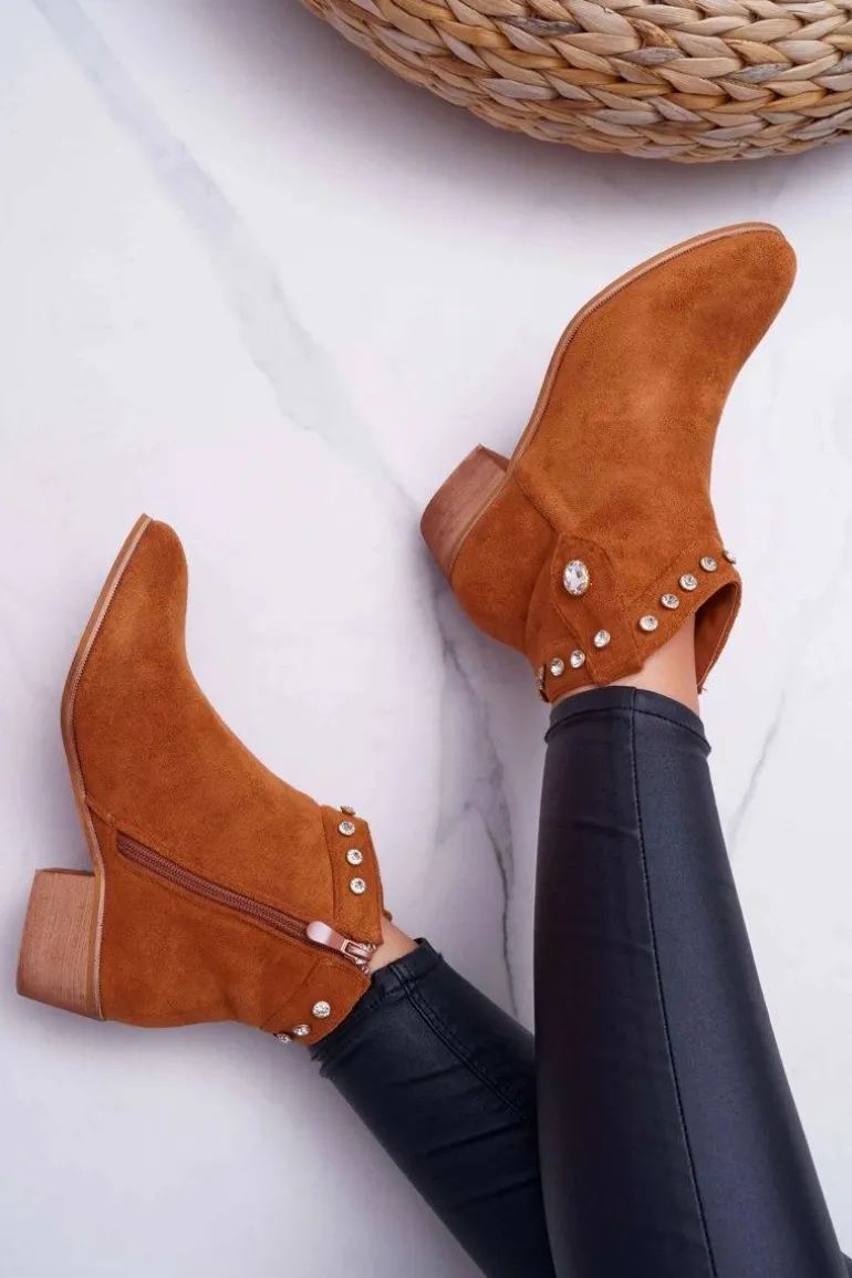 Botki Damskie Płaski Obcas Kowbojki Z Cyrkoniami Camel Patti