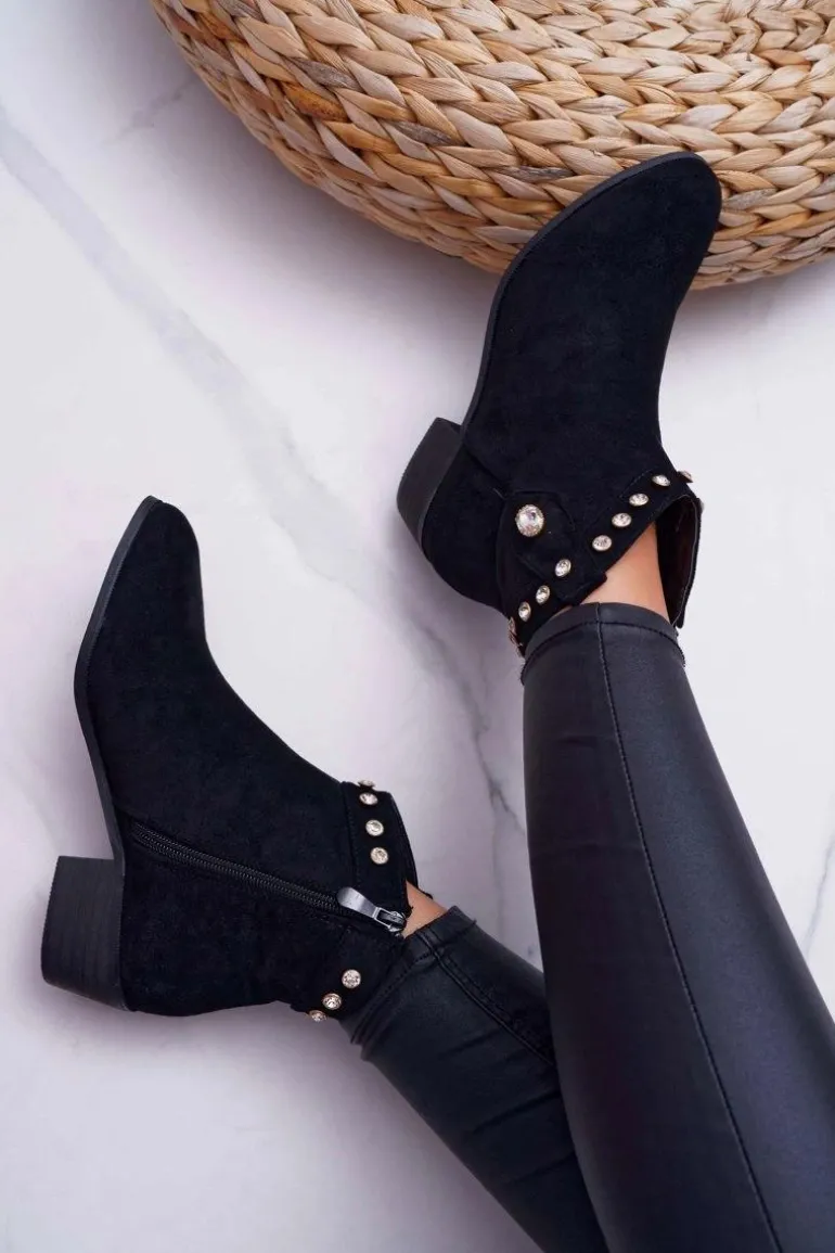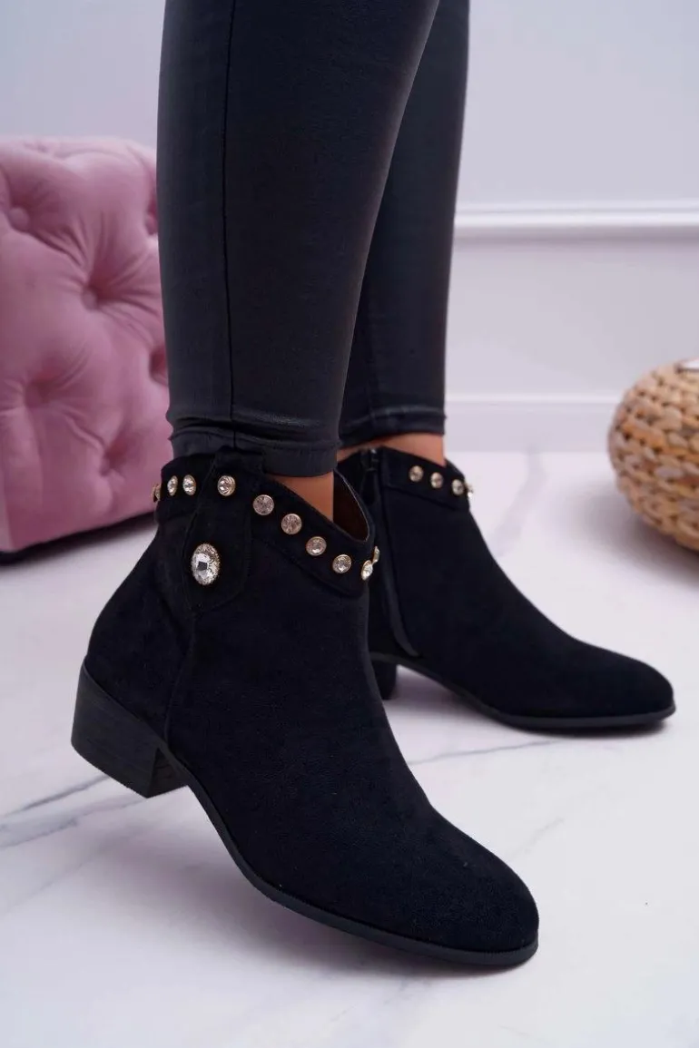 Botki Damskie Płaski Obcas Kowbojki Z Cyrkoniami Czarne Patti