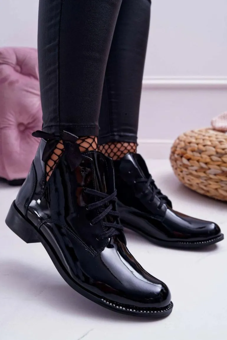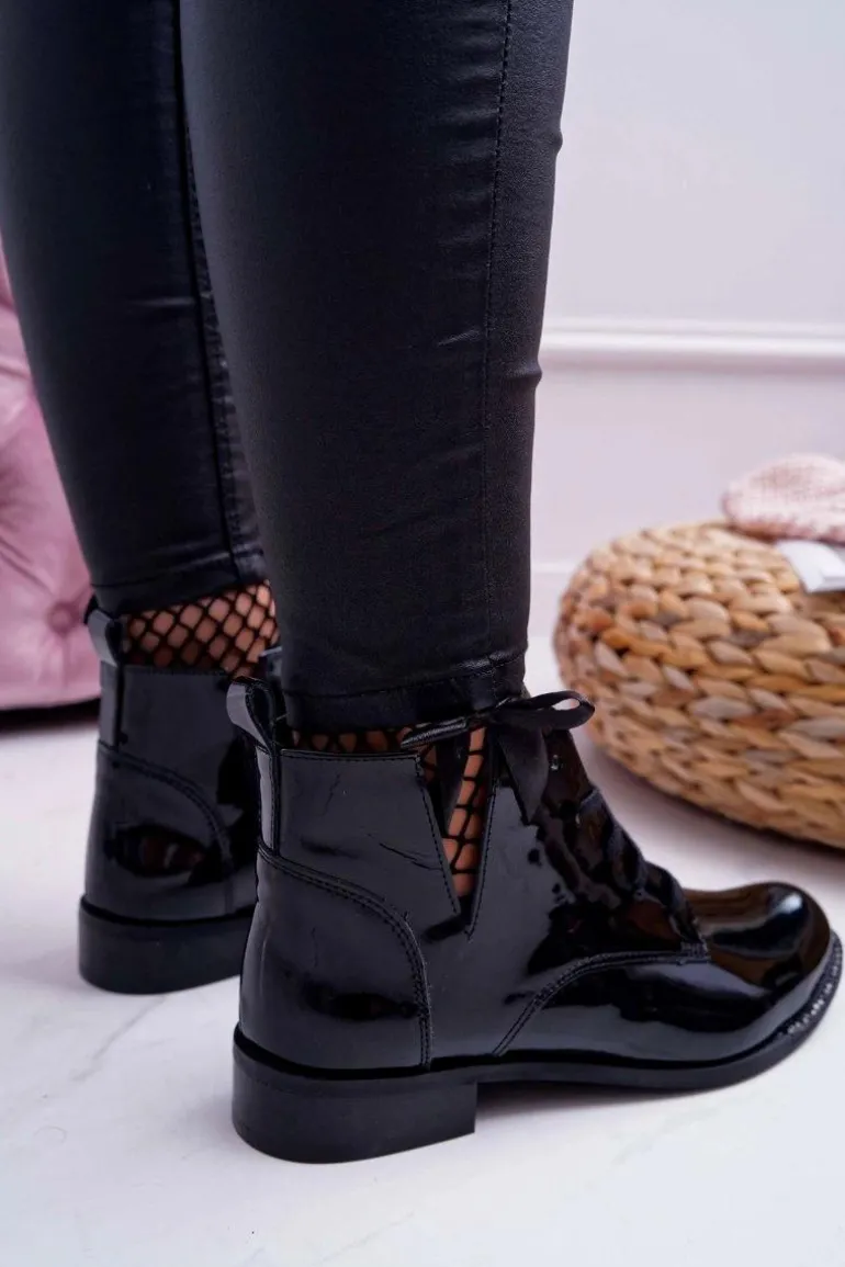 Botki Damskie Płaski Obcas Lakierowane Czarne Nicole 2420