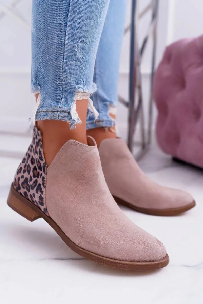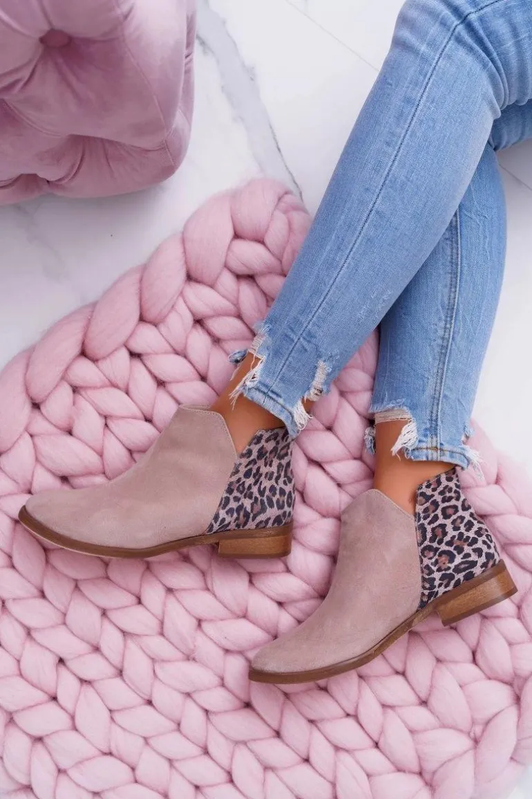Botki to nie tylko buty na chłodne dni. Świetnie sprawdzą się również podczas tworzenia wiosennych stylizacjach. Botki posiadają delikatne wycięcia na wysokości kostek. Płaski obcas oraz wzór w panterkę, który stał się bardzo modny w tym sezonie. Botki w całości wykonane ze skóry zamszowej. Produkt Polski, co gwarantuje nam komfort oraz wysoką jakość wykonania. Idealne do zwiewnych sukienek oraz jeansowych spodni. Przy wyborze rozmiaru prosimy sugerować się tabelą rozmiarów.