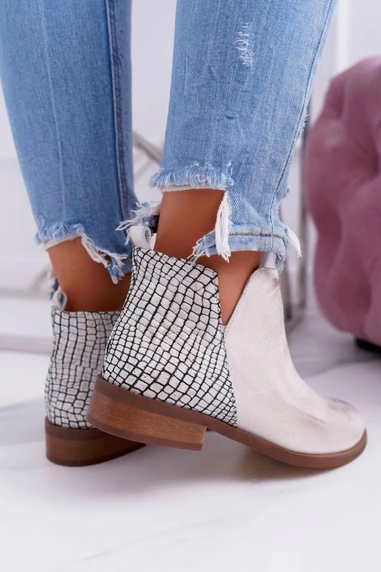 Botki to nie tylko buty na chłodne dni. Świetnie sprawdzą się również podczas tworzenia wiosennych stylizacjach. Botki posiadają delikatne wycięcia na wysokości kostek. Płaski obcas oraz wzór w skórę krokodyla, który stał się bardzo modny w tym sezonie. Botki w całości wykonane ze skóry naturalnej. Produkt Polski, co gwarantuje nam komfort oraz wysoką jakość wykonania. Idealne do zwiewnych sukienek oraz jeansowych spodni. Przy wyborze rozmiaru prosimy sugerować się tabelą rozmiarów.