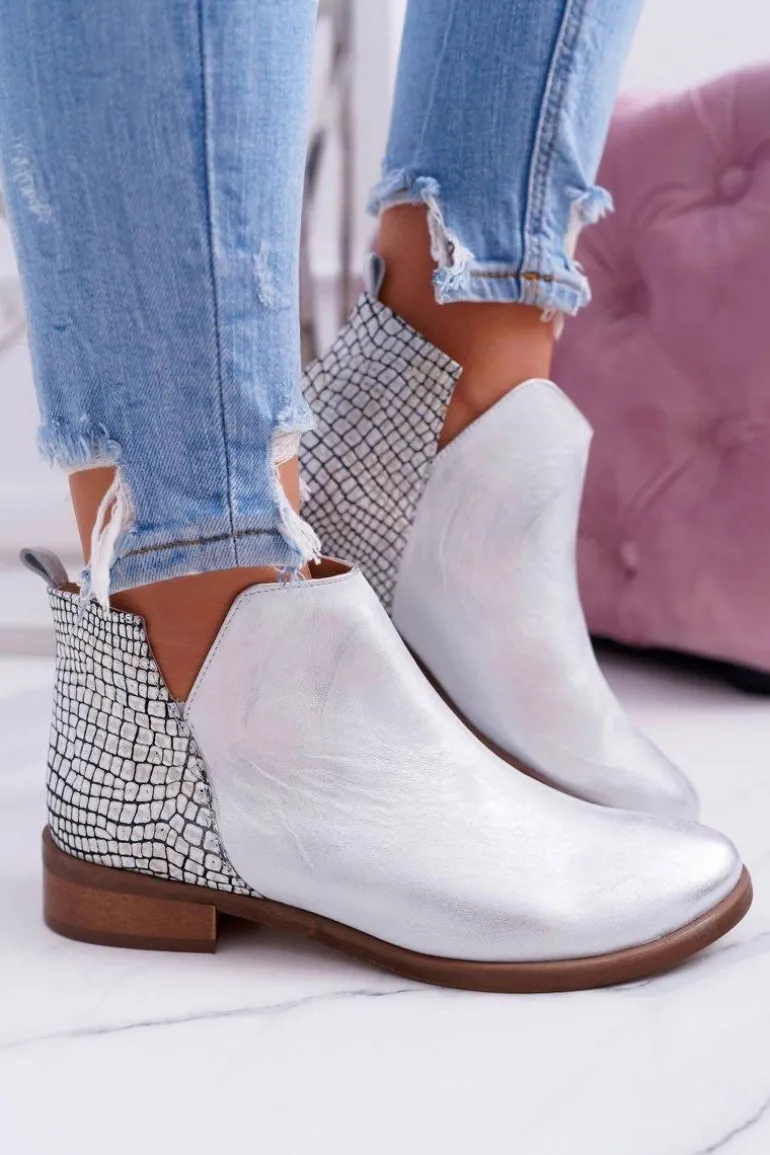 Botki Damskie Płaski Obcas Wiosenne Skórzane Srebrne Madness