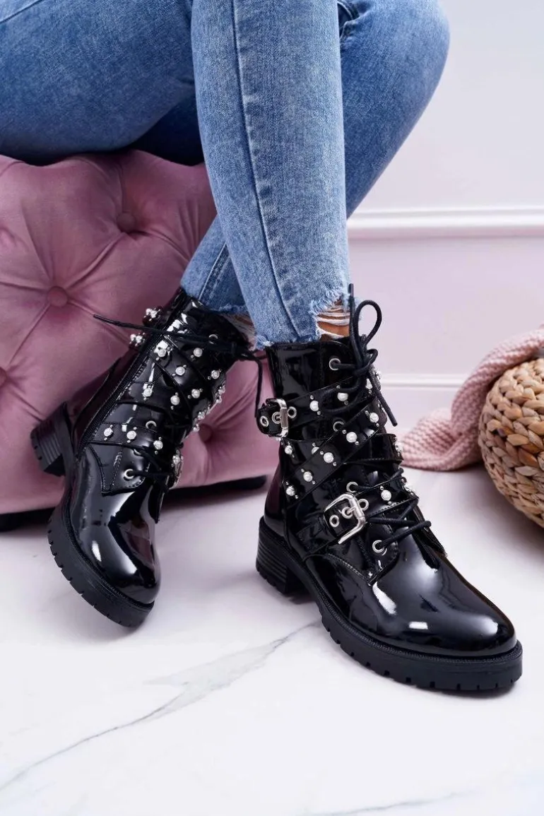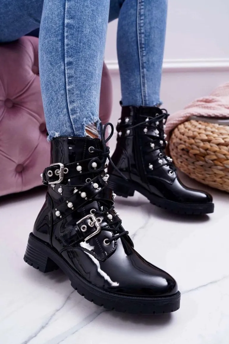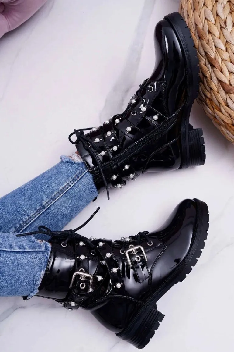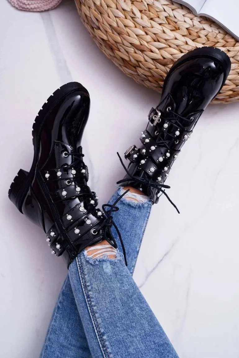 Botki Damskie Płaskie Lakierowane Z Perełkami Czarne Domination