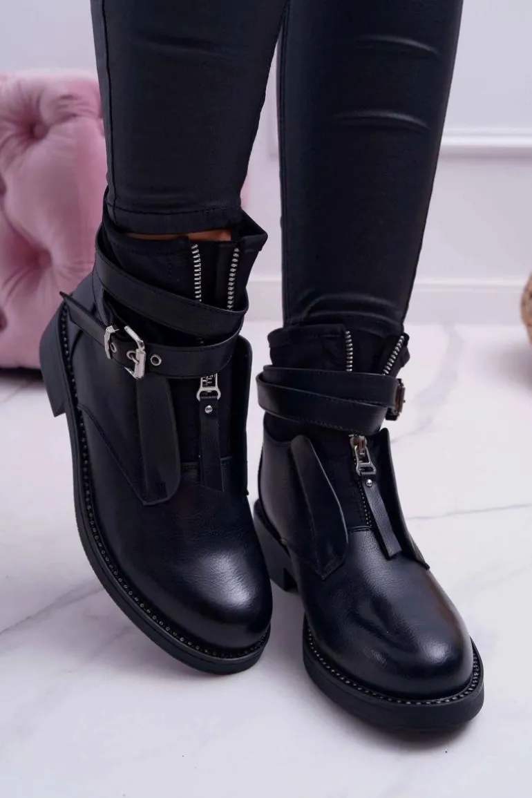 Botki Damskie Płaskie z Kryształkami Klamra Czarne Denovio