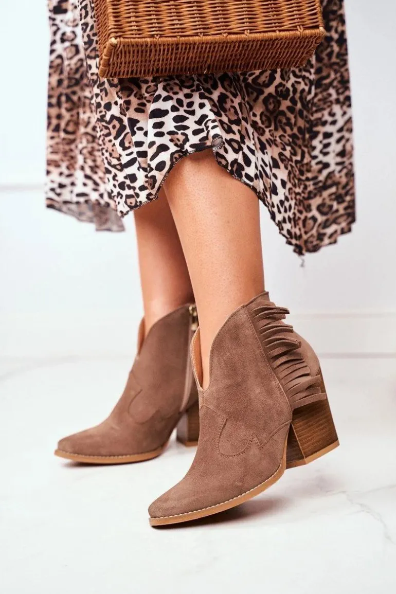 Botki to nie tylko buty na chłodne dni. Świetnie sprawdzą się również podczas tworzenia stylizacji nawet w cieplejsze dni. Botki na boku posiadają suwak ułatwiający zakładanie. W całości wykonane ze skóry zamszowej. Produkt Polski, co gwarantuje nam komfort oraz wysoką jakość wykonania. Idealne do zwiewnych sukienek oraz jeansowych spodni. Przy wyborze rozmiaru prosimy sugerować się tabelą rozmiarów.