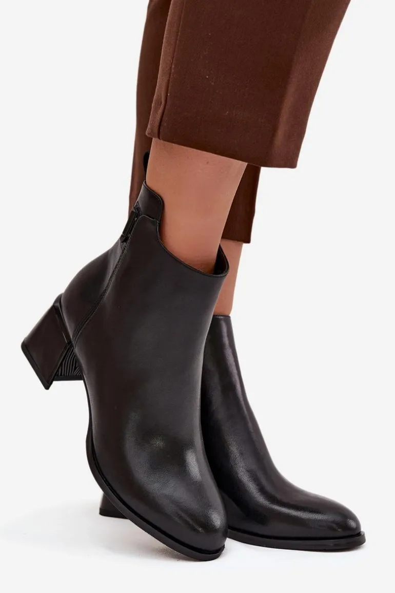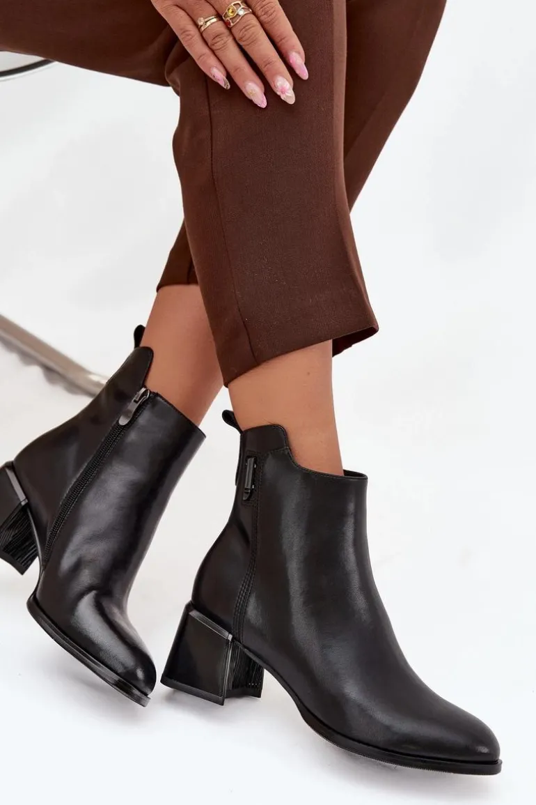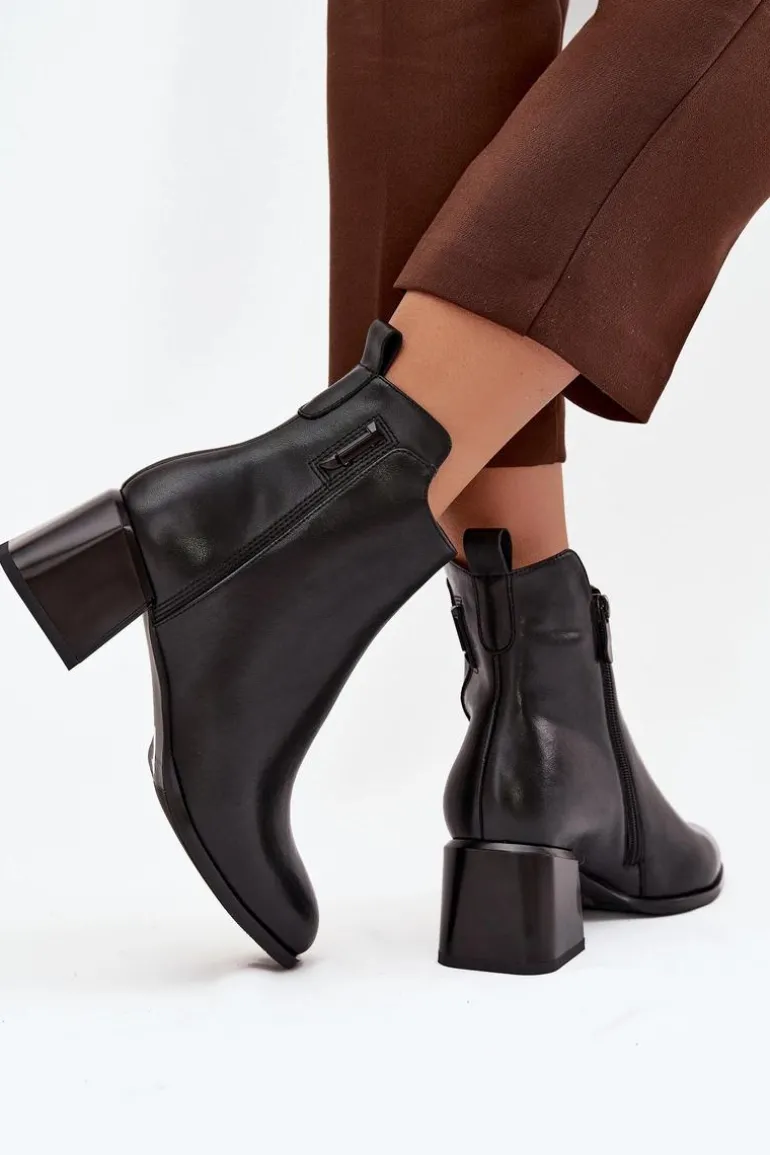 Botki damskie z naturalnej skóry to elegancka propozycja na sezon jesienno-zimowy. Osadzone na stabilnym obcasie typu słupek, subtelnie wysmuklają sylwetkę, a jednocześnie zapewniają komfort noszenia. Zamek boczny ułatwia zakładanie, a ocieplenie kocem obuwniczym gwarantuje ciepło w chłodniejsze dni. Na cholewce znajdują się ozdobne przeszycia oraz subtelny detal z boku, które dodają całości wyjątkowego charakteru. To uniwersalny model, idealny zarówno do codziennych, jak i formalnych stylizacji.