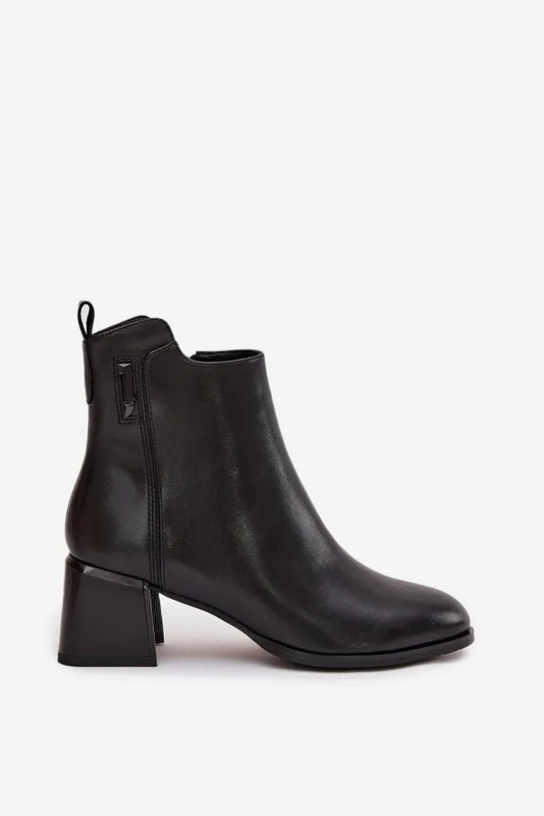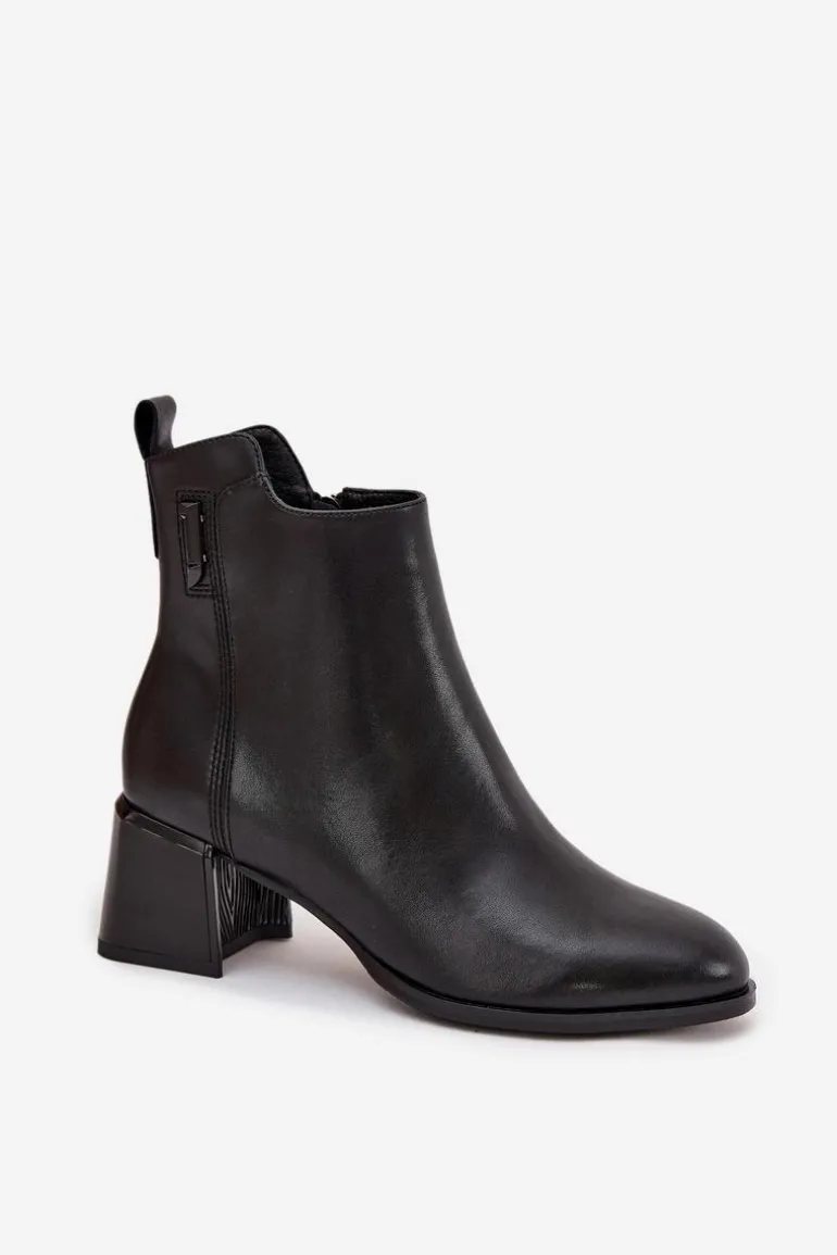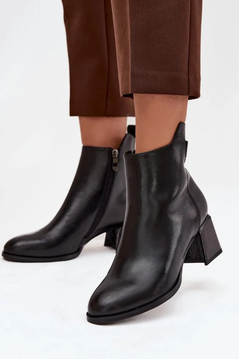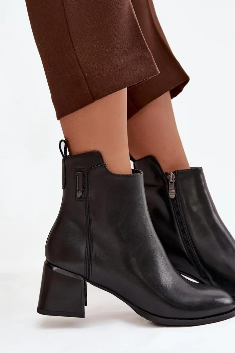 Botki damskie z naturalnej skóry to elegancka propozycja na sezon jesienno-zimowy. Osadzone na stabilnym obcasie typu słupek, subtelnie wysmuklają sylwetkę, a jednocześnie zapewniają komfort noszenia. Zamek boczny ułatwia zakładanie, a ocieplenie kocem obuwniczym gwarantuje ciepło w chłodniejsze dni. Na cholewce znajdują się ozdobne przeszycia oraz subtelny detal z boku, które dodają całości wyjątkowego charakteru. To uniwersalny model, idealny zarówno do codziennych, jak i formalnych stylizacji.