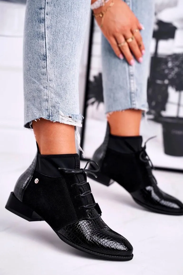 Niezwykle stylowe trzewiki od firmy Maciejka już dostępne! Na pewno przykuwają uwagę swoim niecodziennym designem. Połączenia kilku rodzajów skór o różnej fakturze, nadaje im iście eleganckiego i modnego stylu. Delikatny płaski obcas oraz sznurowana cholewka. Z takimi butami, Ty i Twoje stylizacje z pewnością zostaniecie zauważone. Przy wyborze rozmiaru prosimy sugerować się tabelą rozmiarów.