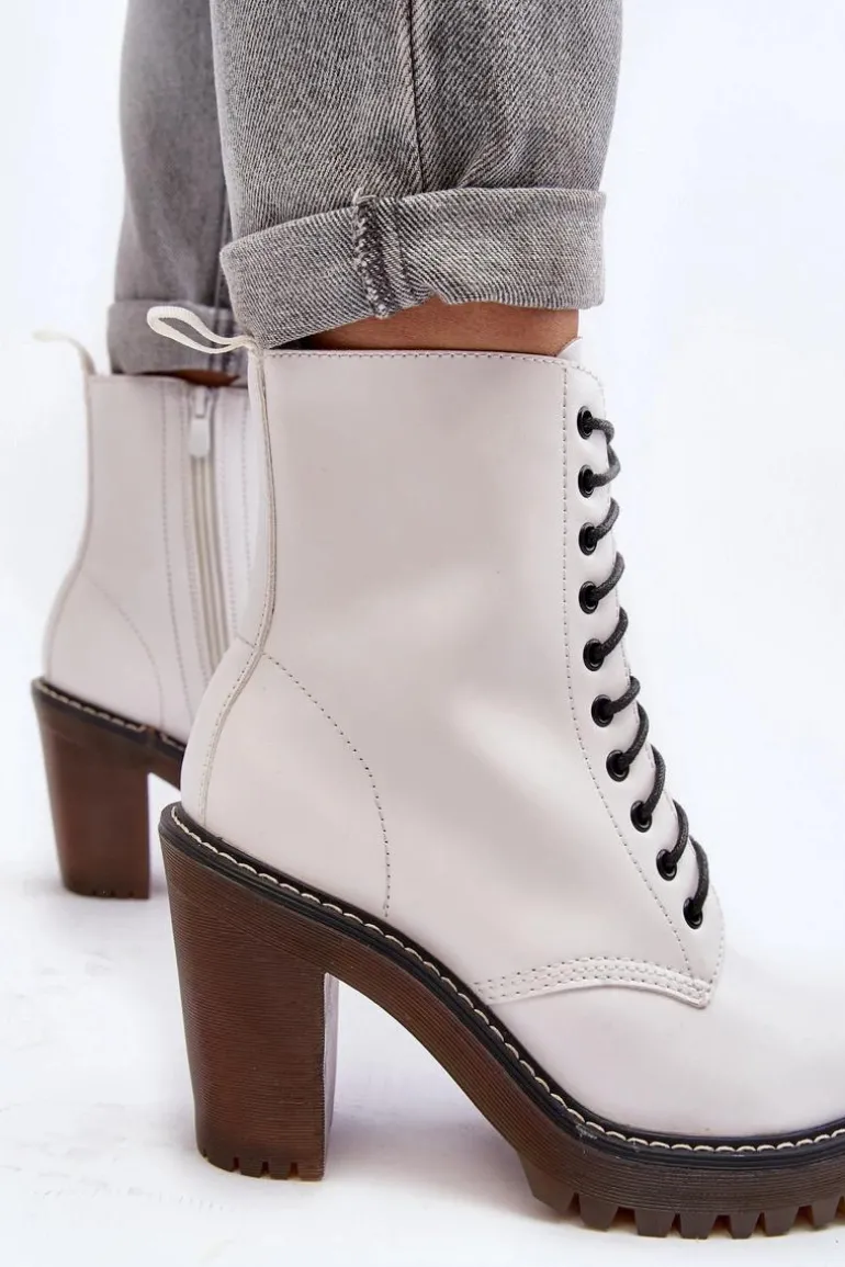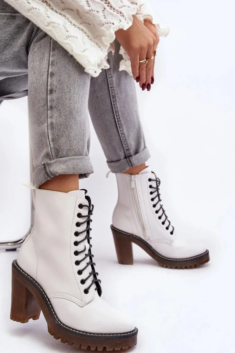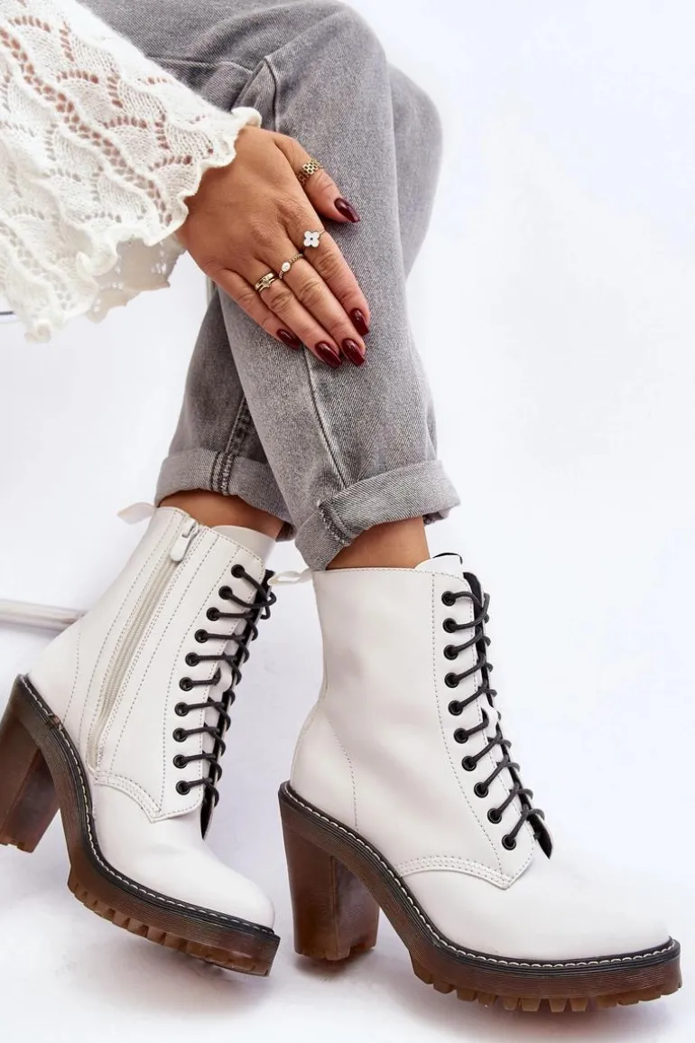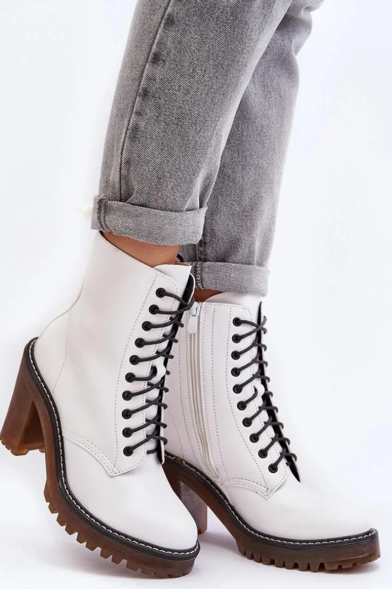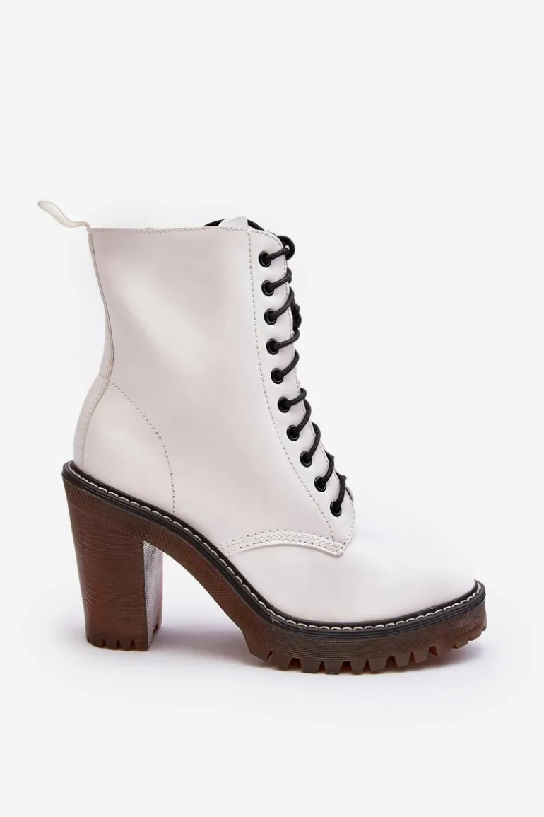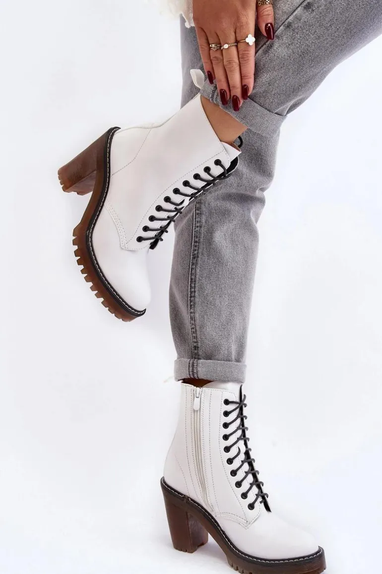 Botki damskie wykonane z eko skóry. Osadzone na obcasie w postaci słupka. Cholewka za kostkę. Model zapinany na suwak z boku oraz dodatkowo posiada sznurowanie. Wkładka ocieplona kocem obuwniczym. Noski zaokrąglone. Usztywniony zapiętek. Przy wyborze rozmiaru prosimy sugerować się tabelą rozmiarów.