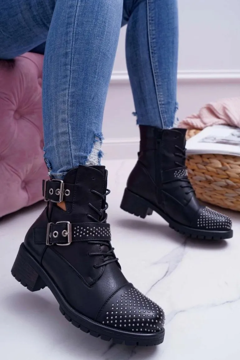 Mamy dla Was coś wyjątkowego! Botki workery z klamrami i nitami, które świetnie wpasują się w nadchodzące trendy. Wykonane z wysokiej jakości skóry ekologicznej. Zdobienia w postaci pasków z nitami nadają im niesamowitego mocnego charakteru. Wnętrze pokryte kocem obuwniczym z krótkim futerkiem. Rozmiarówka standardowa, sugerujemy wybór swojego rozmiaru.