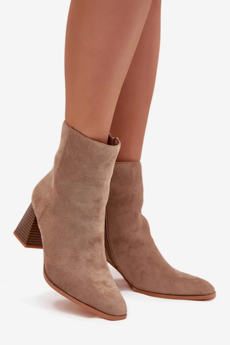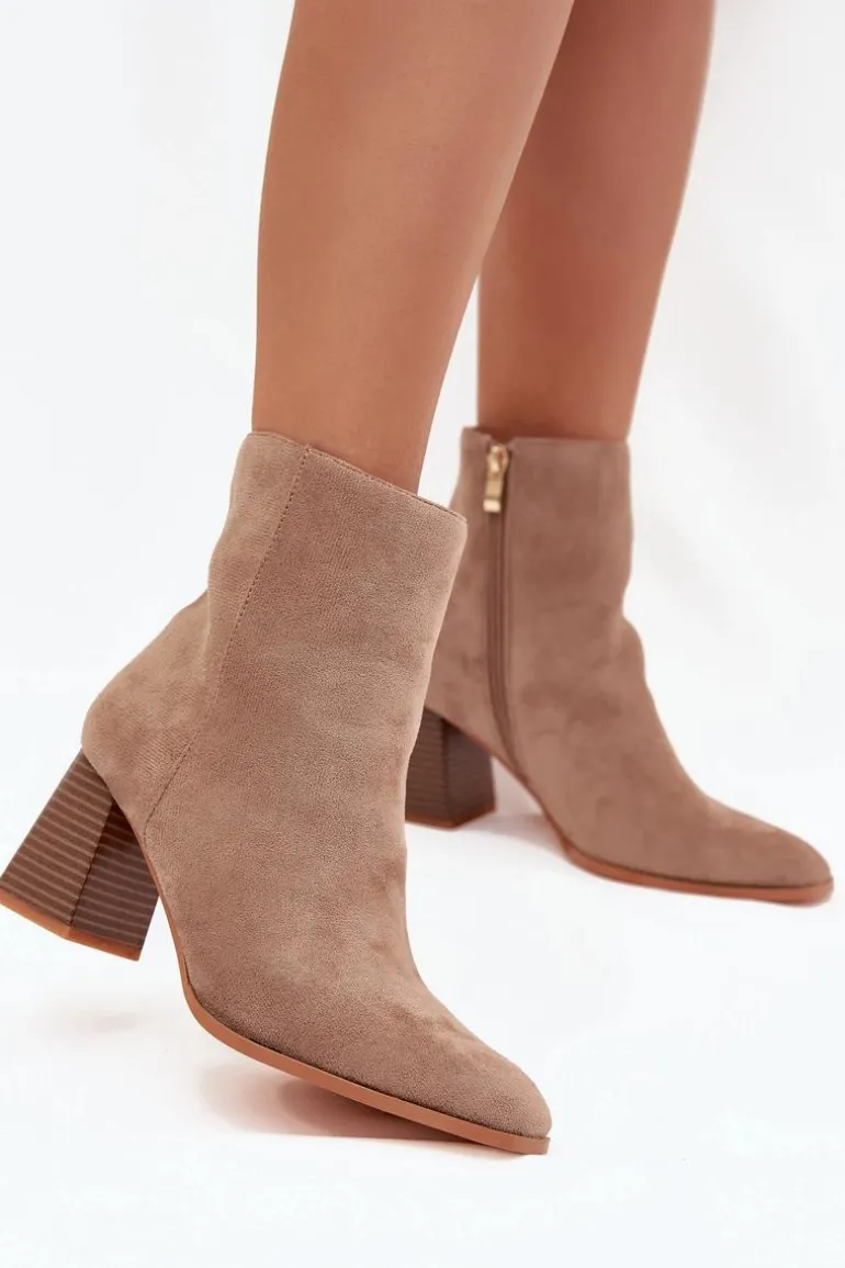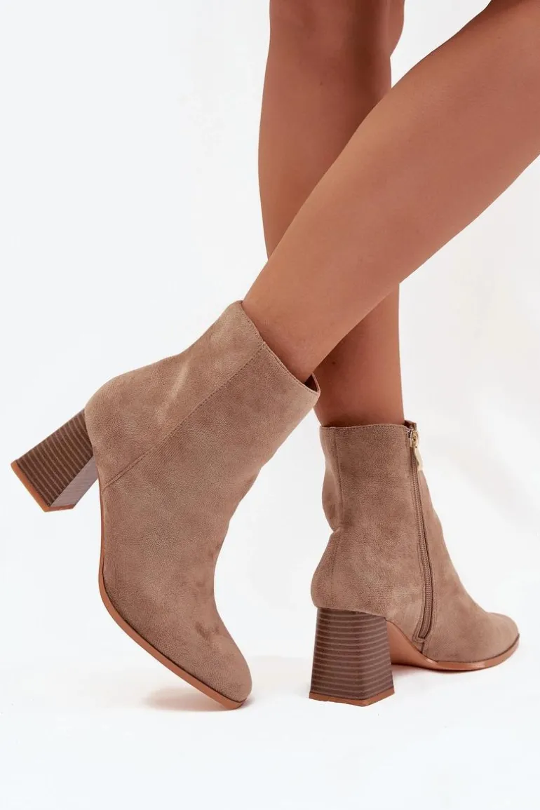 Botki damskie z eko zamszu, osadzone na obcasie w formie słupka, to elegancka propozycja na chłodniejsze dni. Zapinane na zamek, zapewniają łatwość zakładania i idealne dopasowanie do stopy. Noski są delikatnie zaokrąglone, co dodaje im subtelności i komfortu. Idealne do codziennych stylizacji, świetnie komponują się z sukienkami, spódnicami czy spodniami, łącząc styl z wygodą. Przy wyborze rozmiaru prosimy sugerować się tabelą rozmiarów.