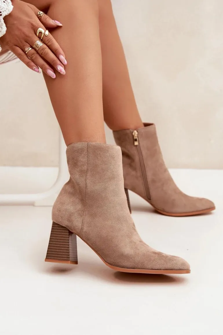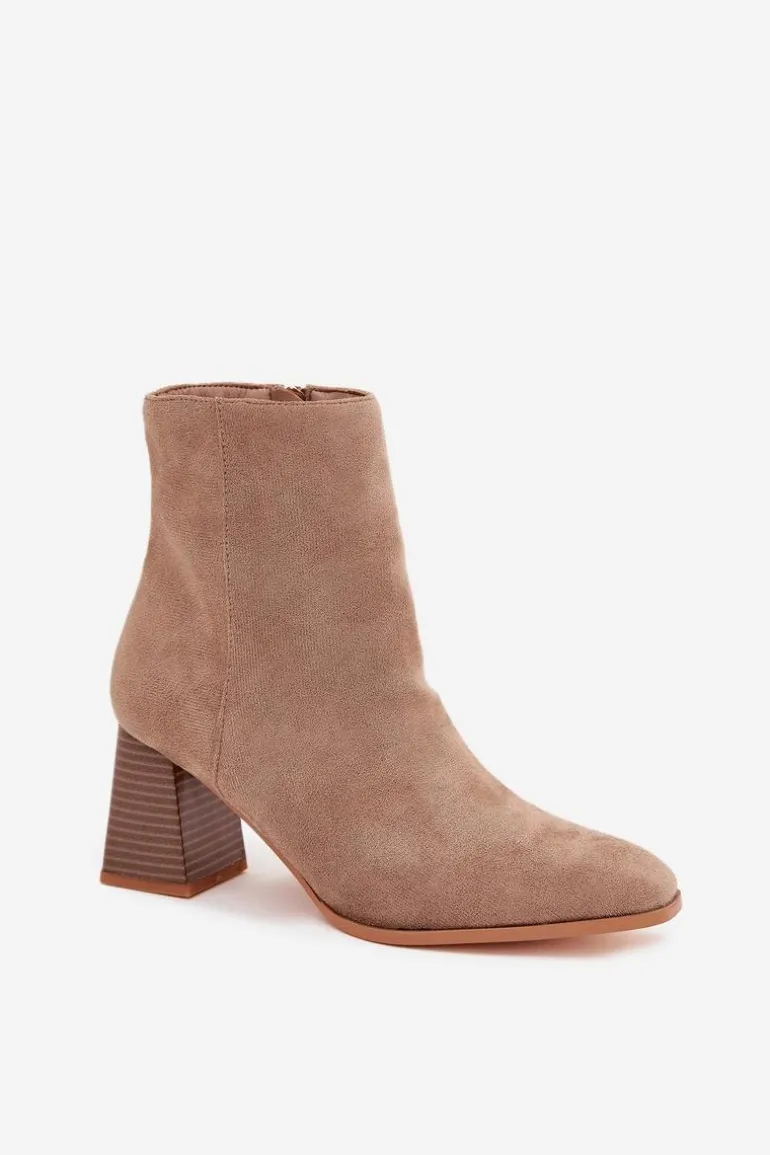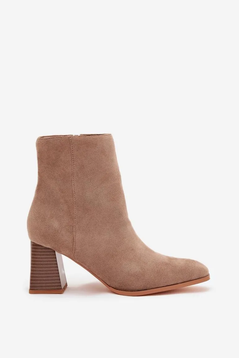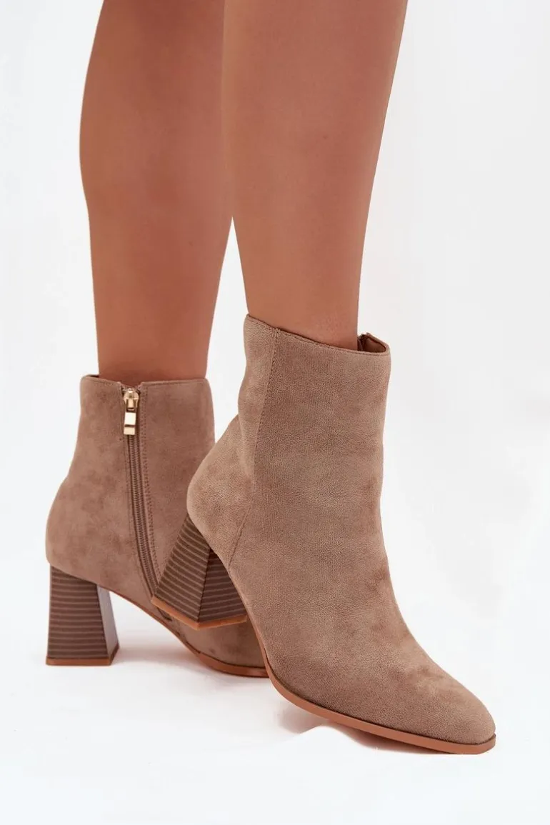 Botki damskie z eko zamszu, osadzone na obcasie w formie słupka, to elegancka propozycja na chłodniejsze dni. Zapinane na zamek, zapewniają łatwość zakładania i idealne dopasowanie do stopy. Noski są delikatnie zaokrąglone, co dodaje im subtelności i komfortu. Idealne do codziennych stylizacji, świetnie komponują się z sukienkami, spódnicami czy spodniami, łącząc styl z wygodą. Przy wyborze rozmiaru prosimy sugerować się tabelą rozmiarów.