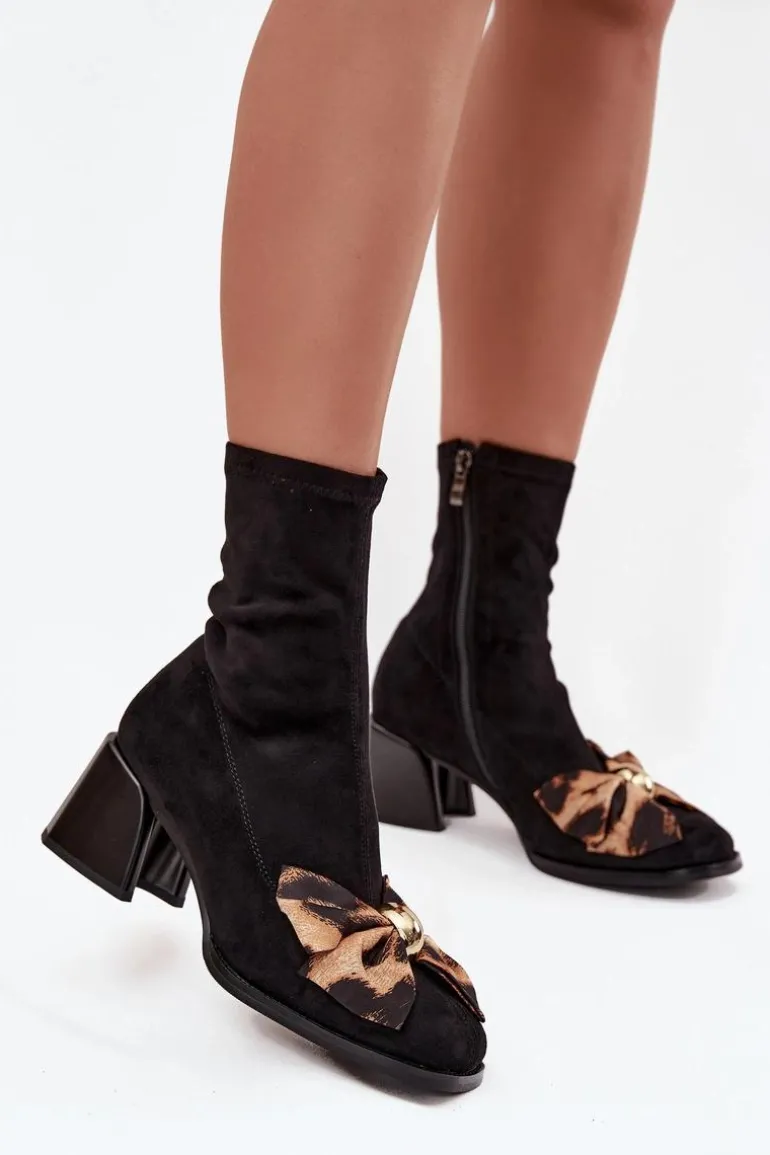 Botki damskie wykonane z miękkiego eko zamszu to połączenie elegancji i kobiecego stylu. Model osadzony na stabilnym obcasie typu klocek zapewnia wygodę podczas codziennego noszenia. Uwagę przyciąga ozdobna kokarda ze złotym elementem z przodu, która dodaje wyjątkowego uroku. Zamek z boku ułatwia zakładanie i zdejmowanie, a zaokrąglone noski nadają całości subtelnego, klasycznego wyglądu. To stylowe botki, które doskonale dopełnią zarówno eleganckie, jak i codzienne stylizacje. Przy wyborze rozmiaru prosimy sugerować się tabelą rozmiarów.