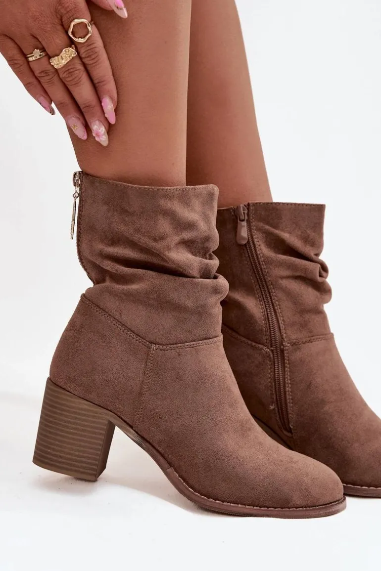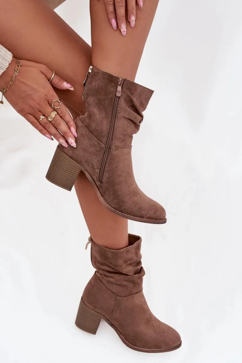 Botki damskie z eko zamszu od marki S.Barski to propozycja, która doskonale sprawdzi się w sezonie jesienno-zimowym. Wykonane z miękkiego, przyjemnego w dotyku materiału, prezentują się bardzo kobieco i modnie. Model został osadzony na stabilnym obcasie typu słupek, który subtelnie wysmukla sylwetkę, a jednocześnie zapewnia wygodę i komfort noszenia nawet przez dłuższy czas. Praktyczne zapięcie na zamek ułatwia zakładanie i zdejmowanie butów, co czyni je funkcjonalnym wyborem na co dzień. Charakterystycznym elementem jest marszczona cholewka, która dodaje całości oryginalności. To model, który doskonale uzupełni zarówno codzienne stylizacje ze spodniami czy legginsami, jak i bardziej kobiece zestawy z sukienką czy spódnicą. Przy wyborze rozmiaru prosimy sugerować się tabelą rozmiarów.
