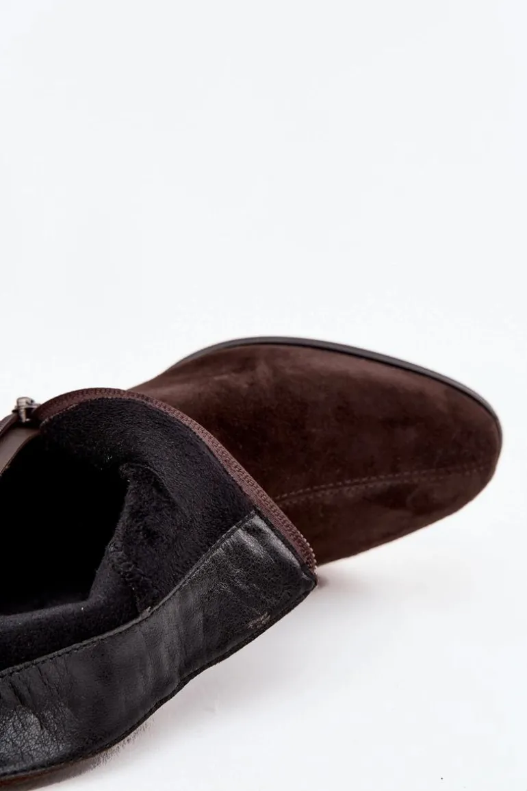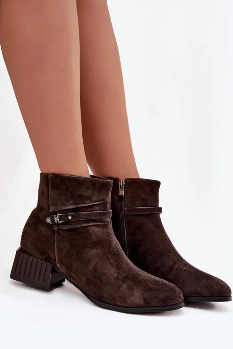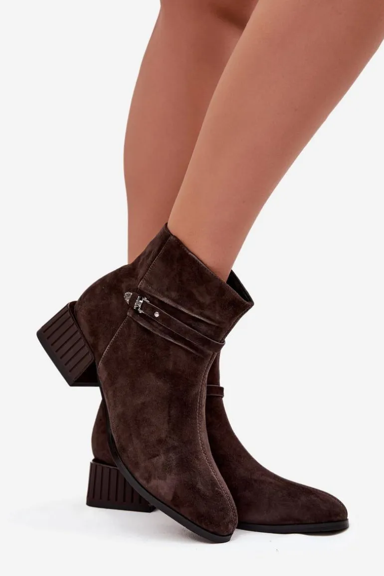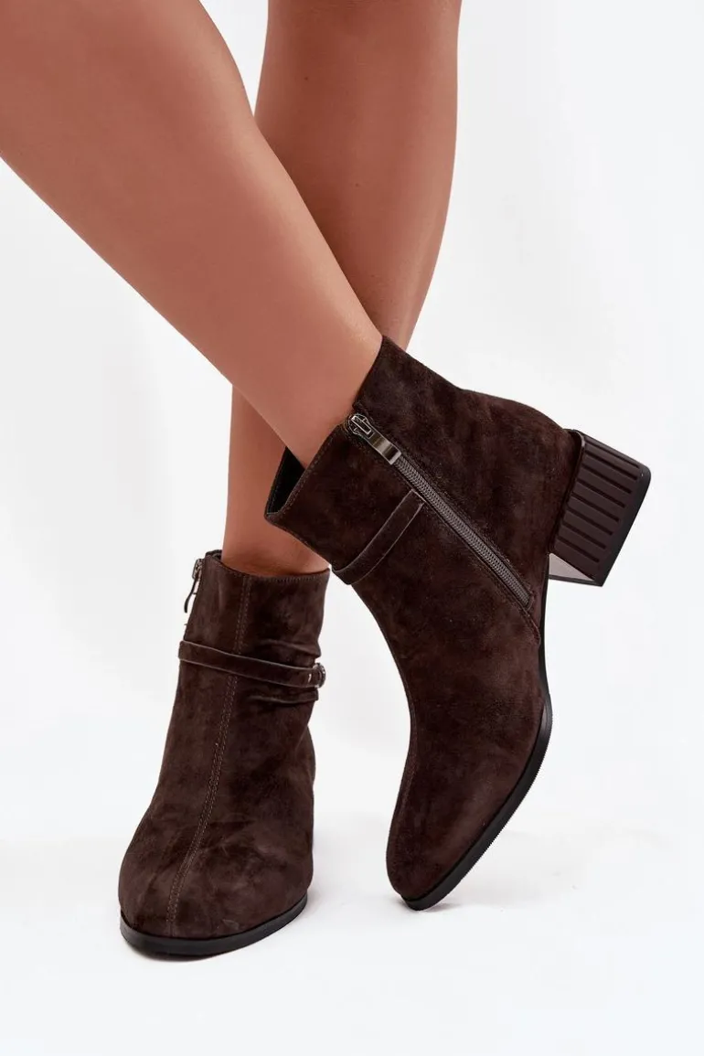Eleganckie botki damskie wykonane z naturalnego zamszu to połączenie klasy i wygody. Model osadzony na stabilnym obcasie typu klocek zapewnia komfort podczas noszenia, a ocieplane wnętrze doskonale sprawdzi się w chłodniejsze dni. Buty zapinane są na zamek, co ułatwia zakładanie. Uroku dodaje im ozdobny paseczek oraz przeszycie biegnące wzdłuż cholewki z przodu, które podkreślają ich stylowy, kobiecy charakter. To doskonały wybór dla kobiet ceniących elegancję w codziennym wydaniu – idealne do pracy, na spotkania i na co dzień. Przy wyborze rozmiaru prosimy sugerować się tabelą rozmiarów.