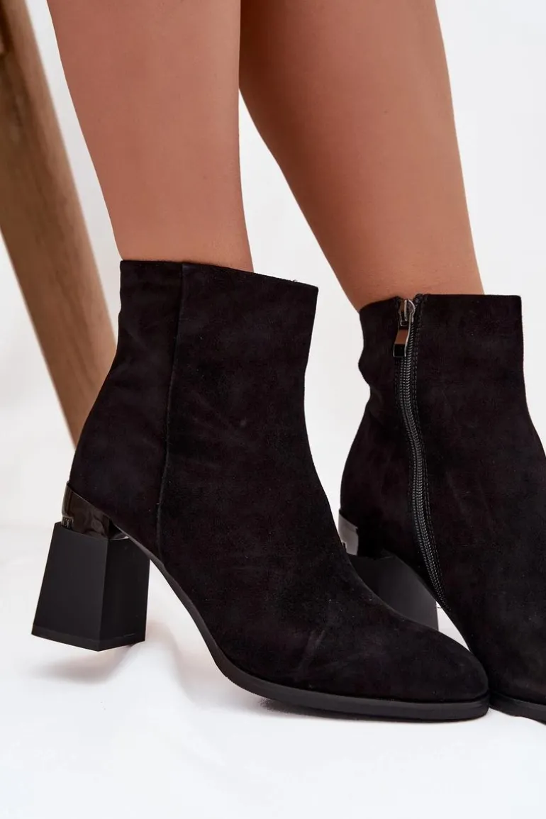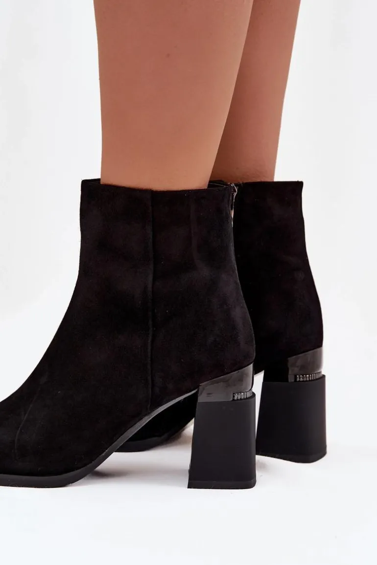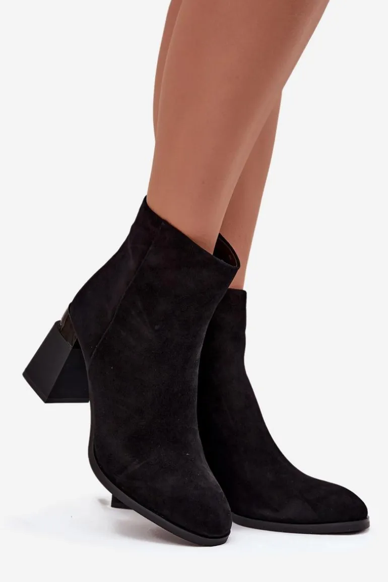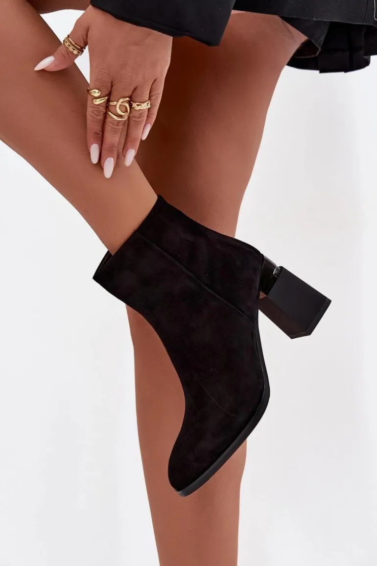 Botki damskie z naturalnego zamszu to propozycja, która łączy klasyczną elegancję z codzienną wygodą. Wykonane z wysokiej jakości materiału, prezentują się niezwykle stylowo. Model osadzony na stabilnym obcasie typu słupek pięknie wysmukla sylwetkę, jednocześnie zapewniając komfort noszenia. Buty posiadają praktyczne zapięcie na zamek, które ułatwia zakładanie i zdejmowanie, a delikatnie zaokrąglone noski podkreślają klasyczny wygląd. Ocieplane wnętrze gwarantuje przyjemne ciepło w chłodniejsze dni, dzięki czemu model świetnie sprawdzi się w okresie jesienno-zimowym. To uniwersalne botki, które idealnie dopełnią zarówno eleganckie stylizacje z sukienką, jak i codzienne zestawy z jeansami czy spódnicą.