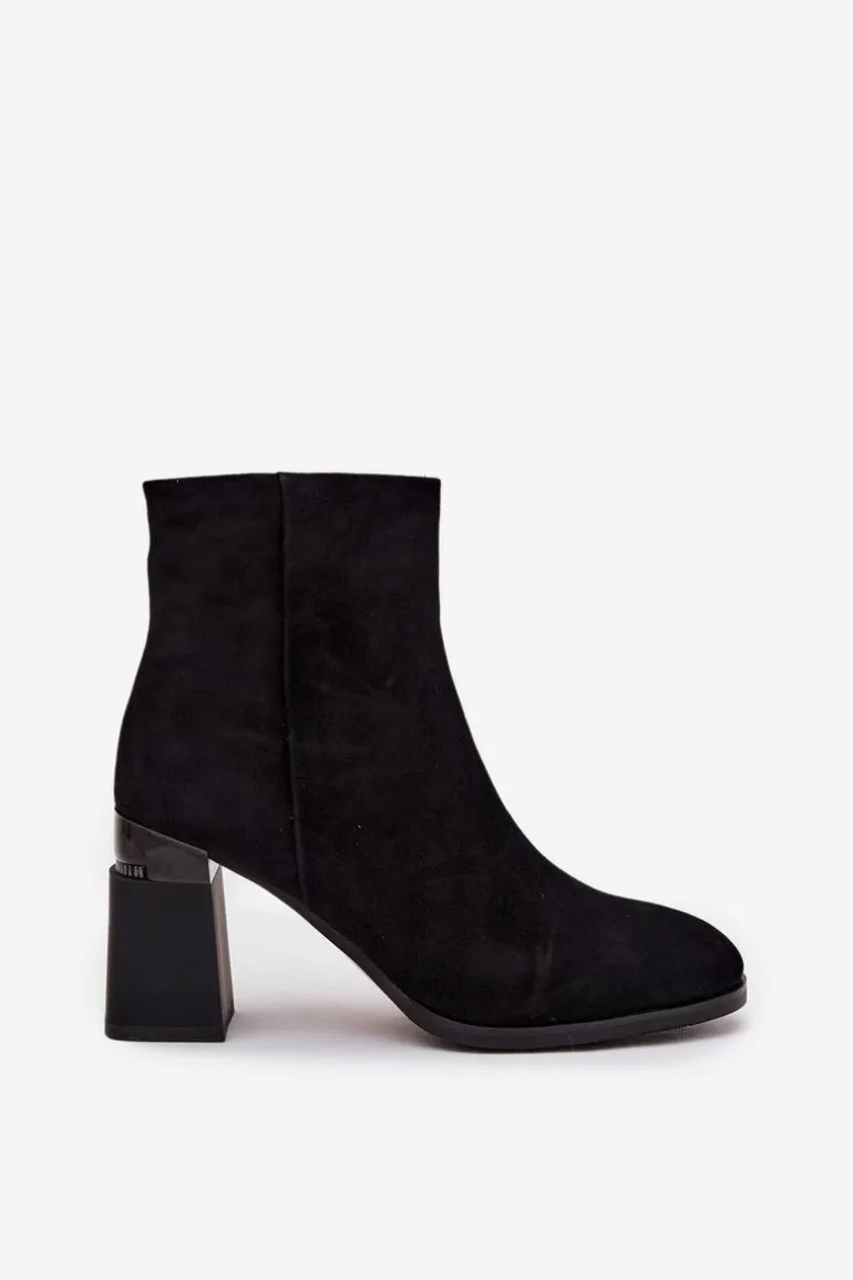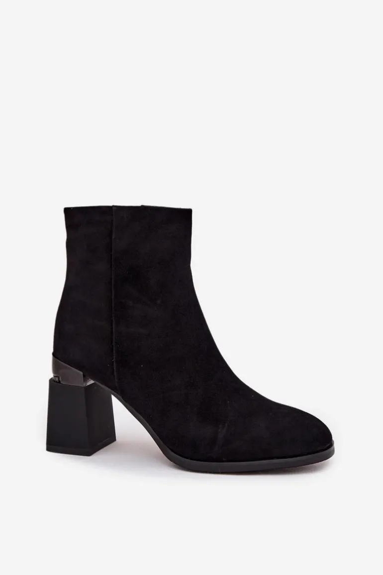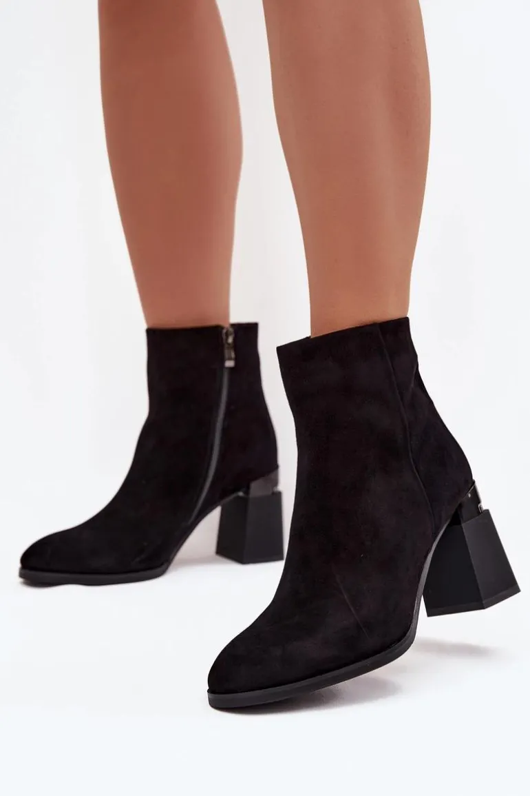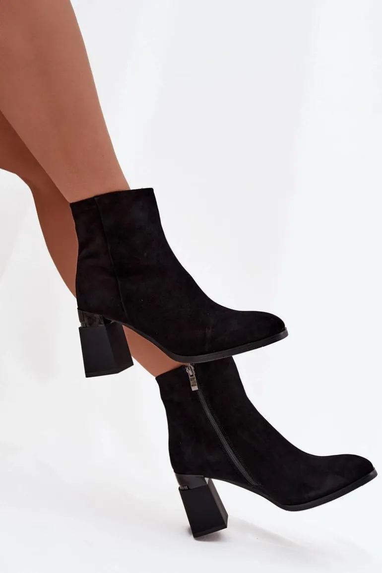 Botki damskie z naturalnego zamszu to propozycja, która łączy klasyczną elegancję z codzienną wygodą. Wykonane z wysokiej jakości materiału, prezentują się niezwykle stylowo. Model osadzony na stabilnym obcasie typu słupek pięknie wysmukla sylwetkę, jednocześnie zapewniając komfort noszenia. Buty posiadają praktyczne zapięcie na zamek, które ułatwia zakładanie i zdejmowanie, a delikatnie zaokrąglone noski podkreślają klasyczny wygląd. Ocieplane wnętrze gwarantuje przyjemne ciepło w chłodniejsze dni, dzięki czemu model świetnie sprawdzi się w okresie jesienno-zimowym. To uniwersalne botki, które idealnie dopełnią zarówno eleganckie stylizacje z sukienką, jak i codzienne zestawy z jeansami czy spódnicą.