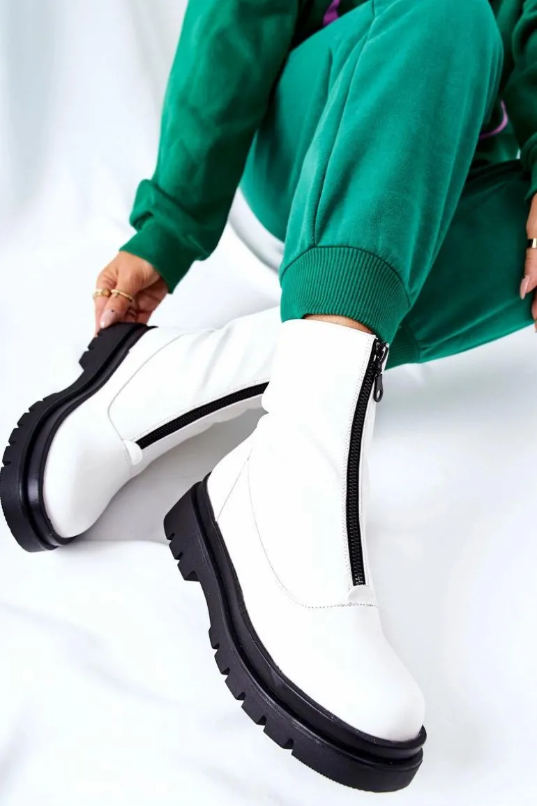 Botki wykonane z ekoskóry. Posiadają suwak na przodzie cholewki, dzięki czemu są wygodne w zakładaniu. Dopasowana cholewka podkreśli Twoje nogi. Przyjemny w dotyku koc obuwniczy przyda się na zimne, jesienne dni.Przy wyborze rozmiaru prosimy sugerować się tabelą rozmiarów.