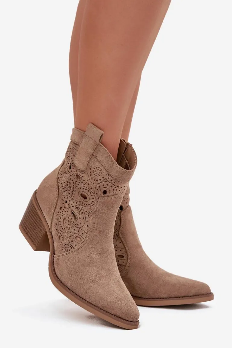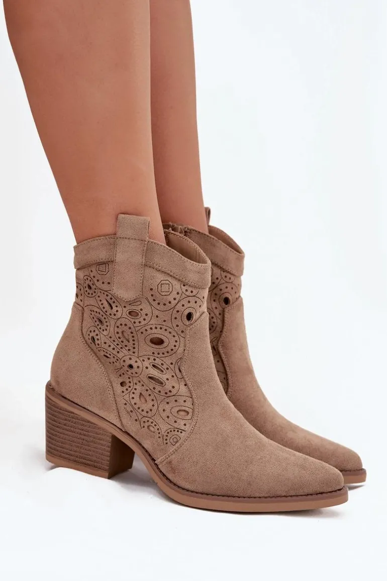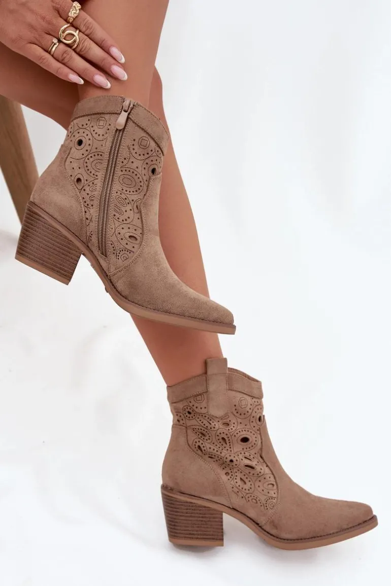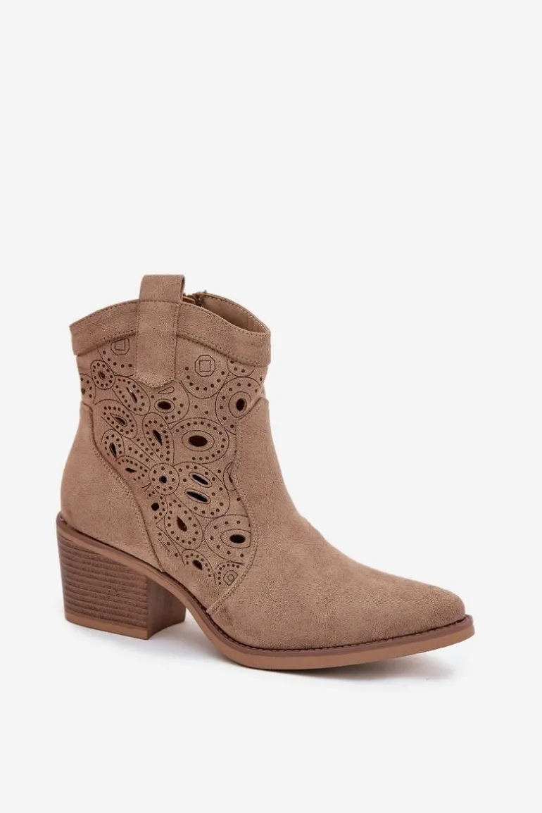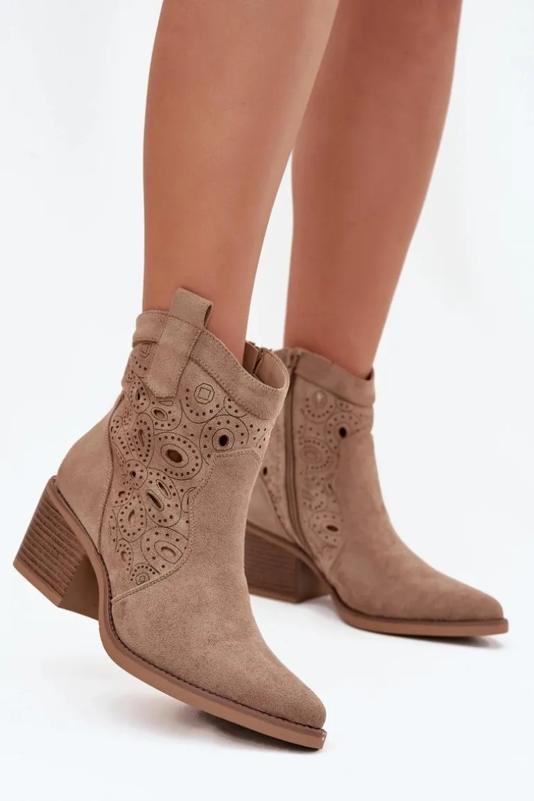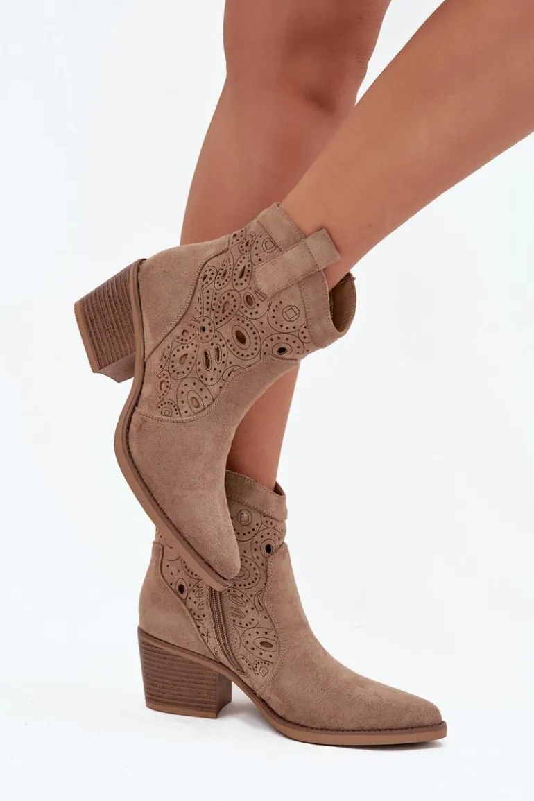 Botki kowbojki damskie z ażurowym wzorem to połączenie klasycznego westernowego stylu z nowoczesnym wyglądem. Wykonane z eko zamszu, prezentują się lekko i stylowo, a delikatne ażurowe wycięcia nadają im wyjątkowego charakteru, wprowadzając subtelną elegancję. Noski w kształcie migdała podkreślają kobiecy fason butów, a zamek po boku zapewnia wygodę i szybkie zakładanie. Te kowbojki doskonale sprawdzą się w casualowych, miejskich stylizacjach, a także jako oryginalny akcent do bardziej wyrazistych outfitów. Idealne dla kobiet, które chcą łączyć komfort z modnym, niebanalnym lookiem. Przy wyborze rozmiaru prosimy sugerować się tabelą rozmiarów.