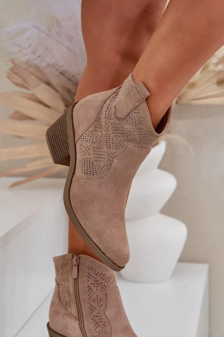 Damskie botki stworzone z delikatnego i przyjemnego w dotyku eko zamszu. Ażurowa cholewka dodaje im lekkości i elegancji, co czyni je doskonałym wyborem na cieplejsze dni. Osadzone na stabilnym obcasie, ten model posiada funkcjonalne zapięcie na zamek, które ułatwia zakładanie i zdejmowanie butów. Noski w migdał. Idealne do codziennych oraz bardziej eleganckich stylizacji. To uniwersalny dodatek do garderoby każdej stylowej kobiety. Przy wyborze rozmiaru prosimy sugerować się tabelą rozmiarów.