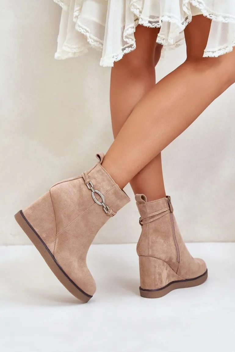 Botki damskie wykonane z eko zamszu, prezentują się niezwykle elegancko. Zapinanie na zamek ułatwia szybkie i wygodne zakładanie oraz zdejmowanie. Osadzone na koturnie. Zapiętek został usztywniony dla dodatkowego wsparcia, a zaokrąglone noski dodają klasycznego uroku. Na cholewce ozdobny paseczek. Wnętrze jest ocieplone kocem obuwniczym, co gwarantuje ciepło i komfort nawet w najchłodniejsze dni. Przy wyborze rozmiaru prosimy sugerować się tabelą rozmiarów.