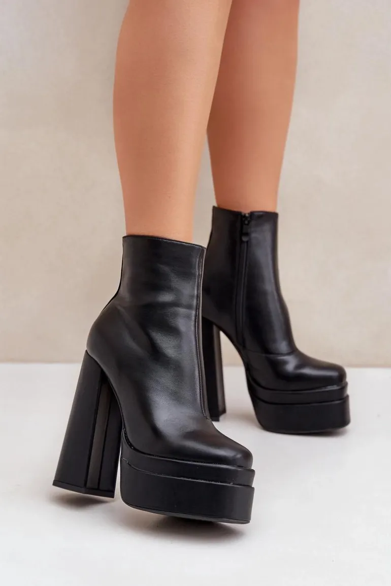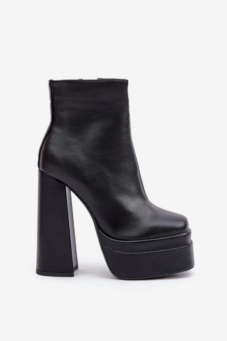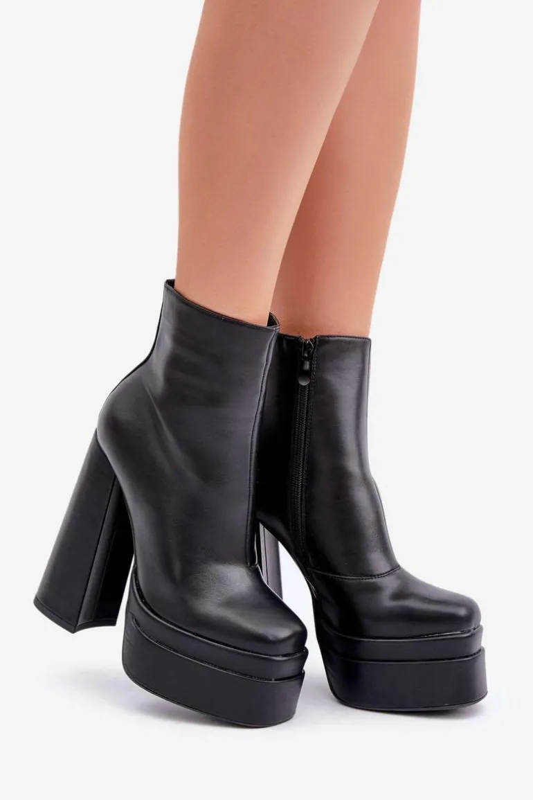 Botki damskie wykonane z eko skóry, osadzone na masywnej platformie i wysokim obcasie, które dodają charakteru każdej stylizacji. Model z zaokrąglonymi noskami zapewnia komfort noszenia. Wnętrze ocieplane kocem obuwniczym, idealne na chłodniejsze dni. Praktyczne zapięcie na zamek ułatwia zakładanie. Stylowe i wygodne, doskonałe na co dzień i specjalne okazje. Przy wyborze rozmiaru prosimy sugerować się tabelą rozmiarów.