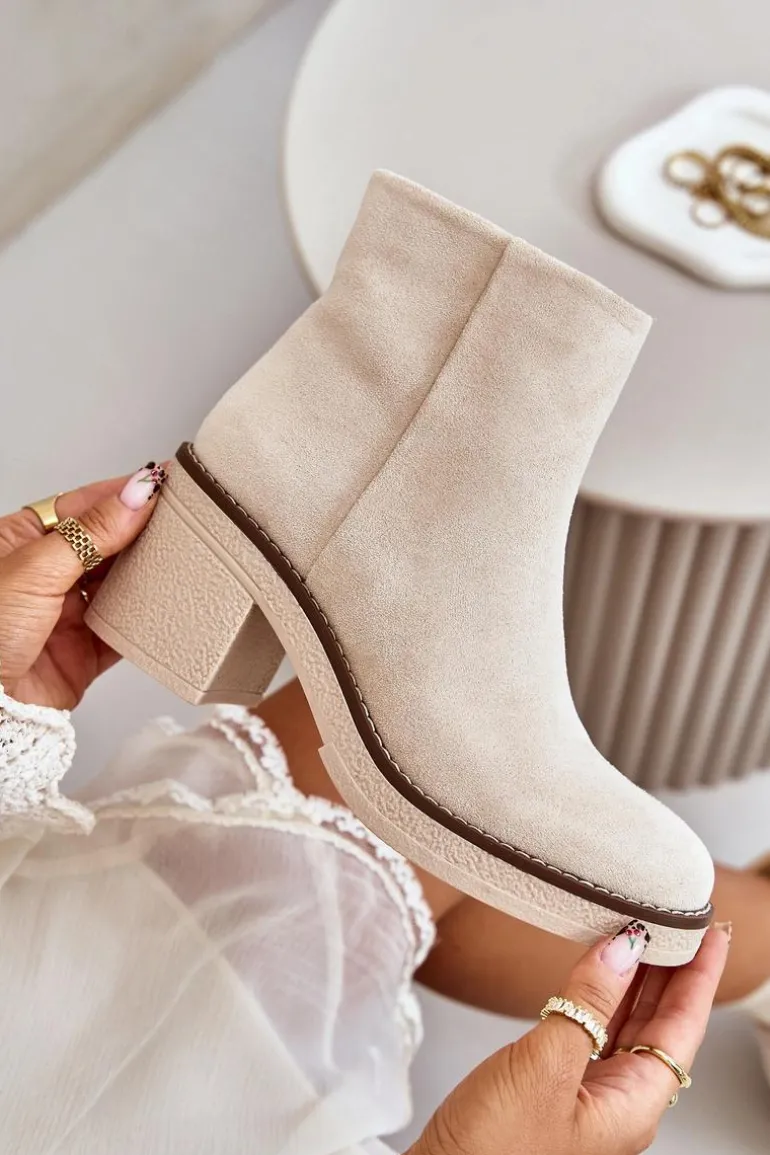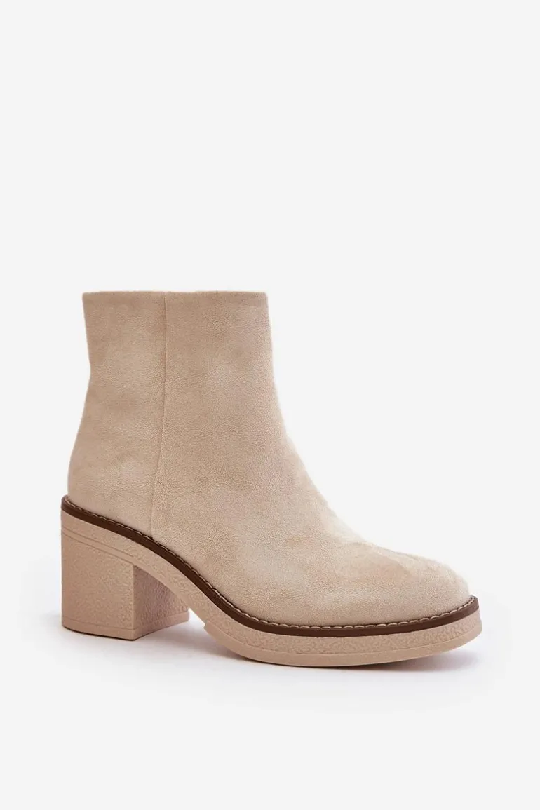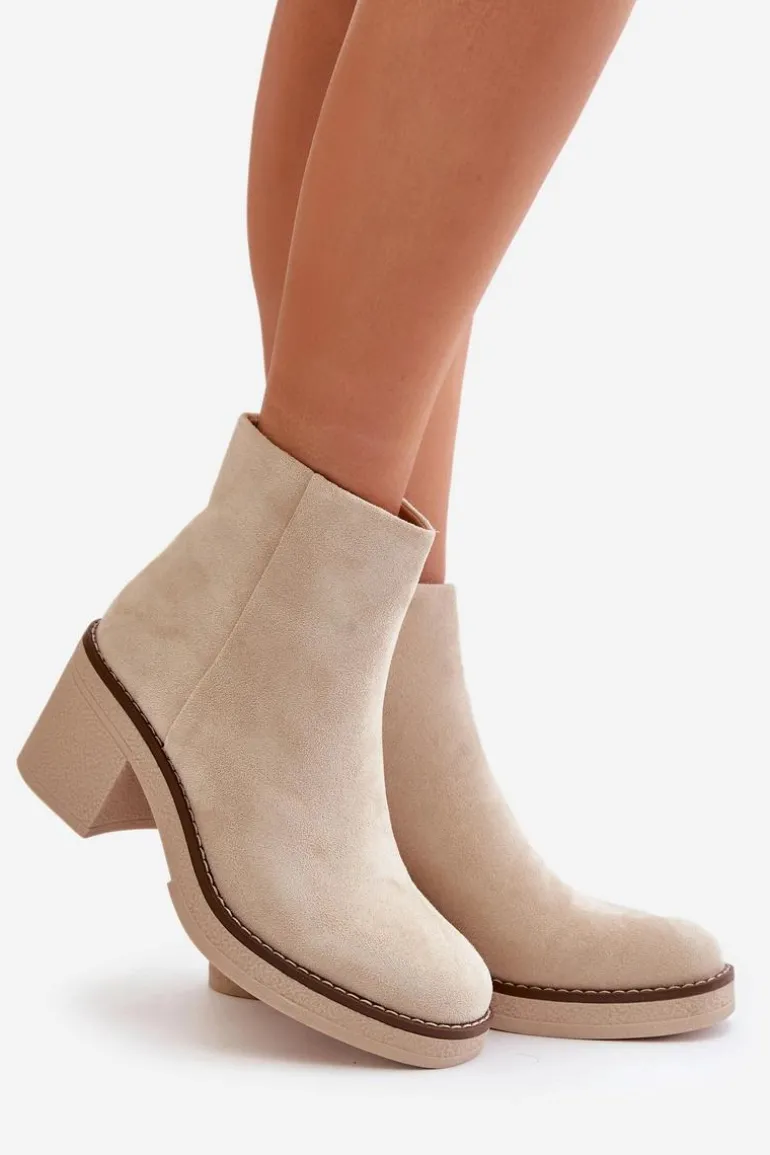 Damskie botki wykonane z eko zamszu. Osadzone na masywnym obcasie typu słupek. Posiadają zaokrąglone noski i praktyczne zapięcie na zamek. Wnętrze ocieplone kocem obuwniczym, co zapewnia komfort w chłodniejsze dni. Ten model z pewnością będzie świetnym dodatkiem do wielu jesiennych stylizacji. Przy wyborze rozmiaru prosimy sugerować się tabelą rozmiarów.