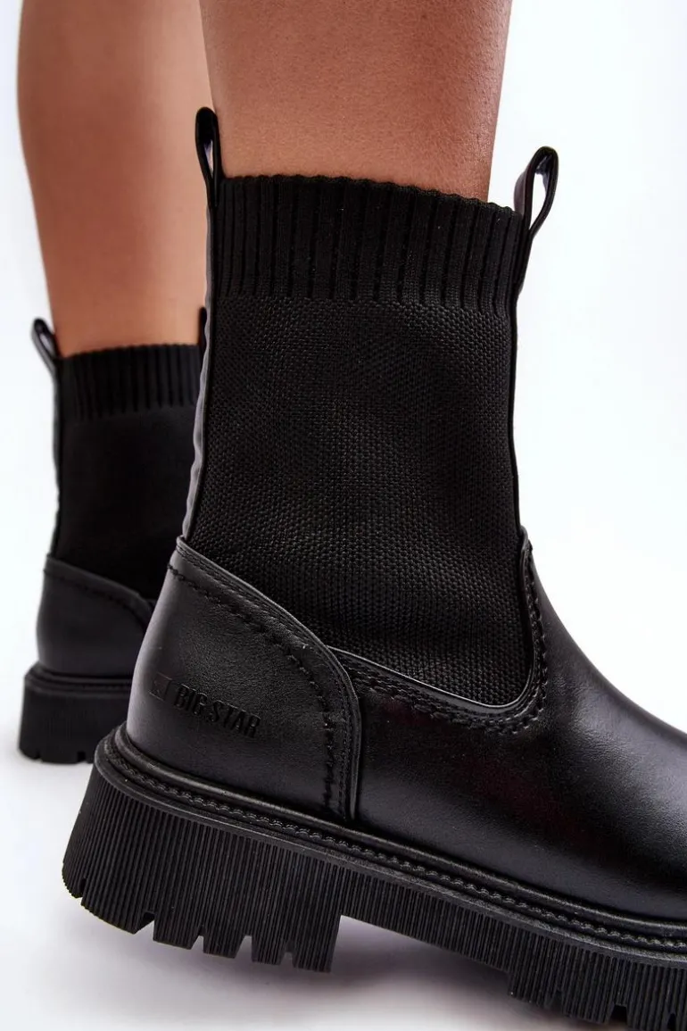 Botki od marki Big Star wykonane z połączenia eko skóry i tkaniny. Osadzone na płaskim obcasie i platformie. Noski zaokrąglone. Cholewka za kostkę. Dodatkowo zapiętek jest usztywniony. Ocieplenie kocem obuwniczym na wysokości stopy. Przy wyborze rozmiaru prosimy sugerować się tabelą rozmiarów.