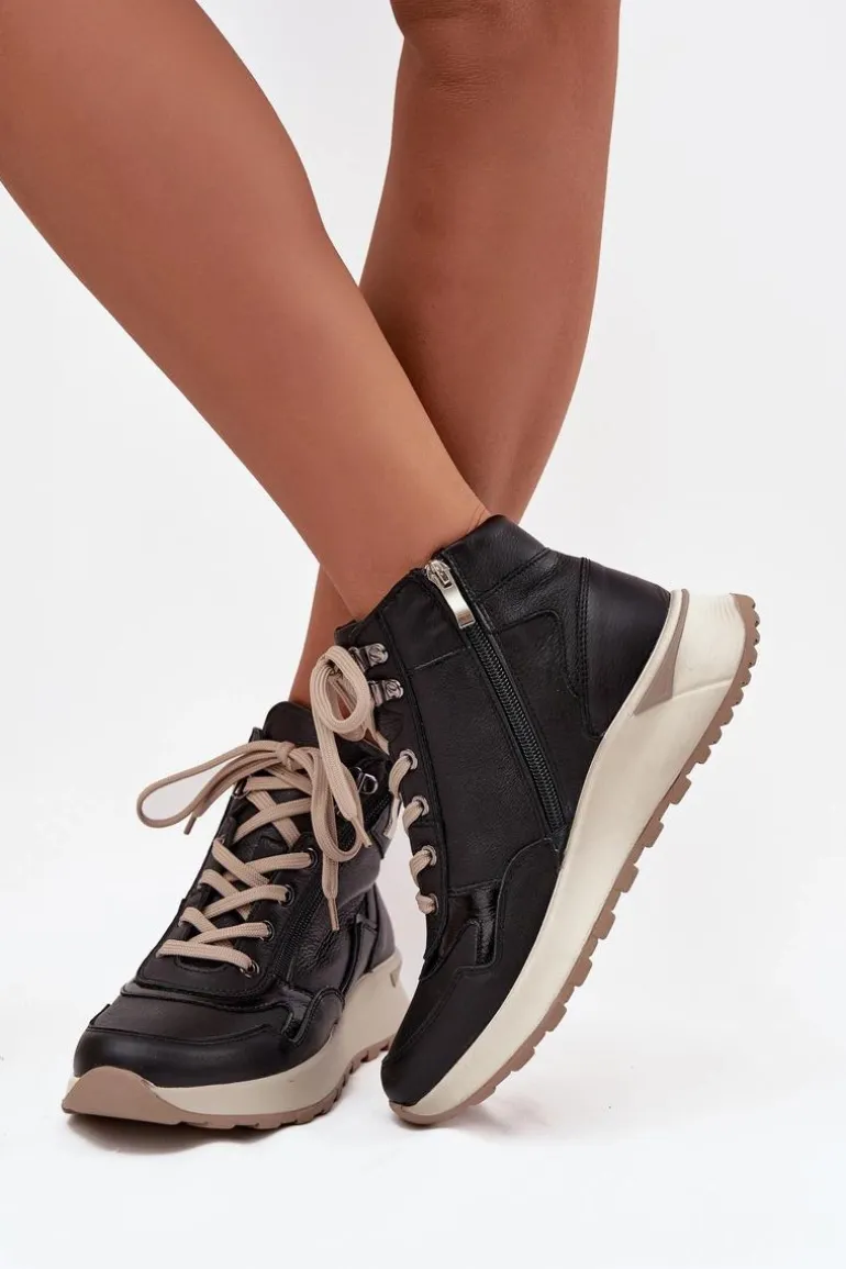 Botki damskie w sportowym stylu wykonane z natrualnej skóry to propozycja łącząca wygodę z modnym, nowoczesnym wyglądem. Osadzone na solidnej platformie zapewniają stabilność i komfort podczas chodzenia, a jednocześnie delikatnie wysmuklają sylwetkę. Model łączy sznurowanie z bocznym zamkiem, co pozwala na idealne dopasowanie do stopy i ułatwia zakładanie oraz zdejmowanie obuwia. Dodatkowo ozdobny zamek z boku cholewki stanowi stylowy detal, który podkreśla sportowy charakter butów, nadając im wyjątkowego i oryginalnego wyglądu. To uniwersalne botki, które sprawdzą się zarówno w codziennych, casualowych stylizacjach, jak i w bardziej wyrazistych, modowych zestawach. Przy wyborze rozmiaru prosimy kierować się tabelą rozmiarów.