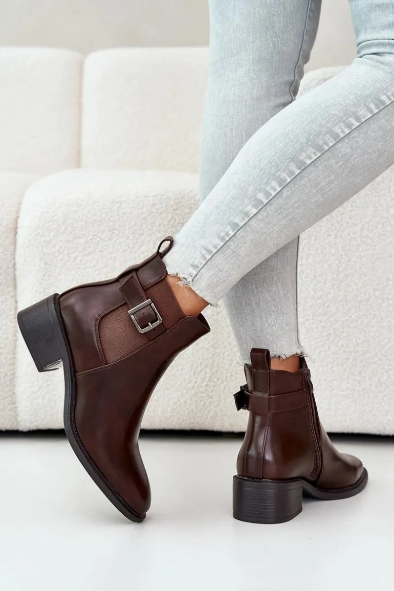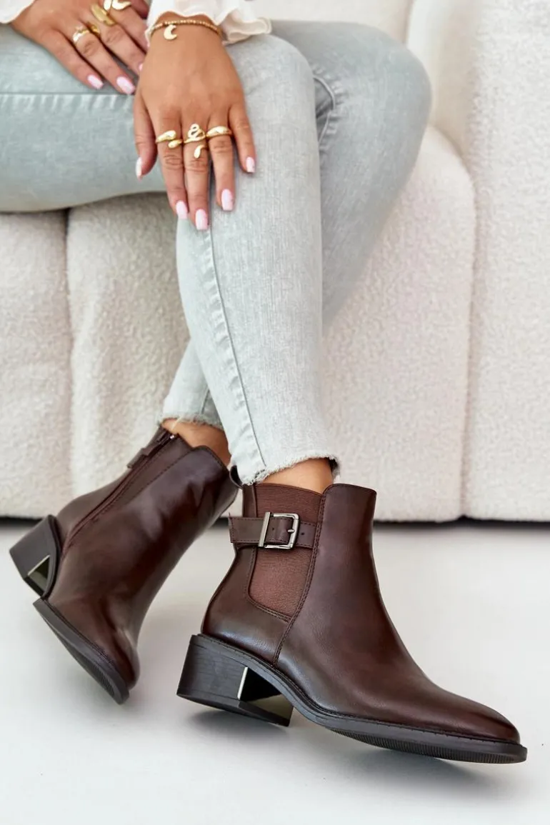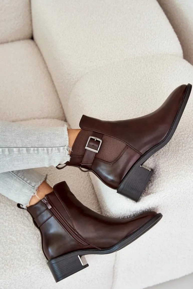 Botki Sztyblety Damskie Na Niskim Obcasie Ze Złotą Klamrą Brązowe Vomera