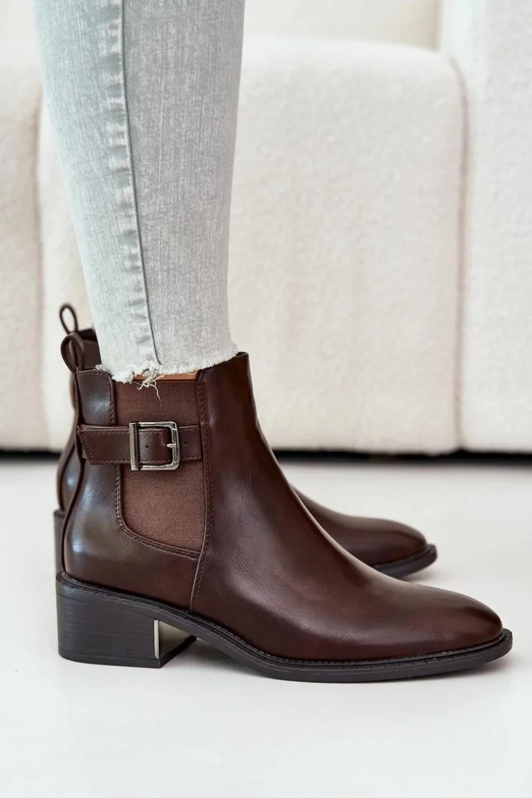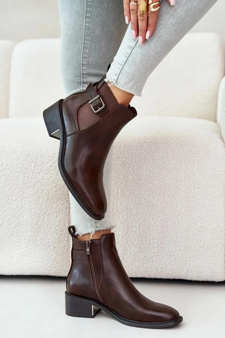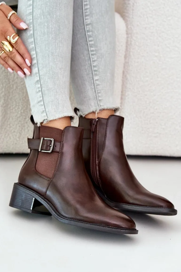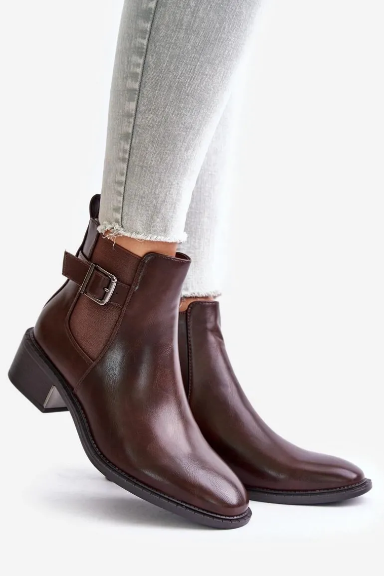 Botki Sztyblety Damskie Na Niskim Obcasie Ze Złotą Klamrą Brązowe Vomera