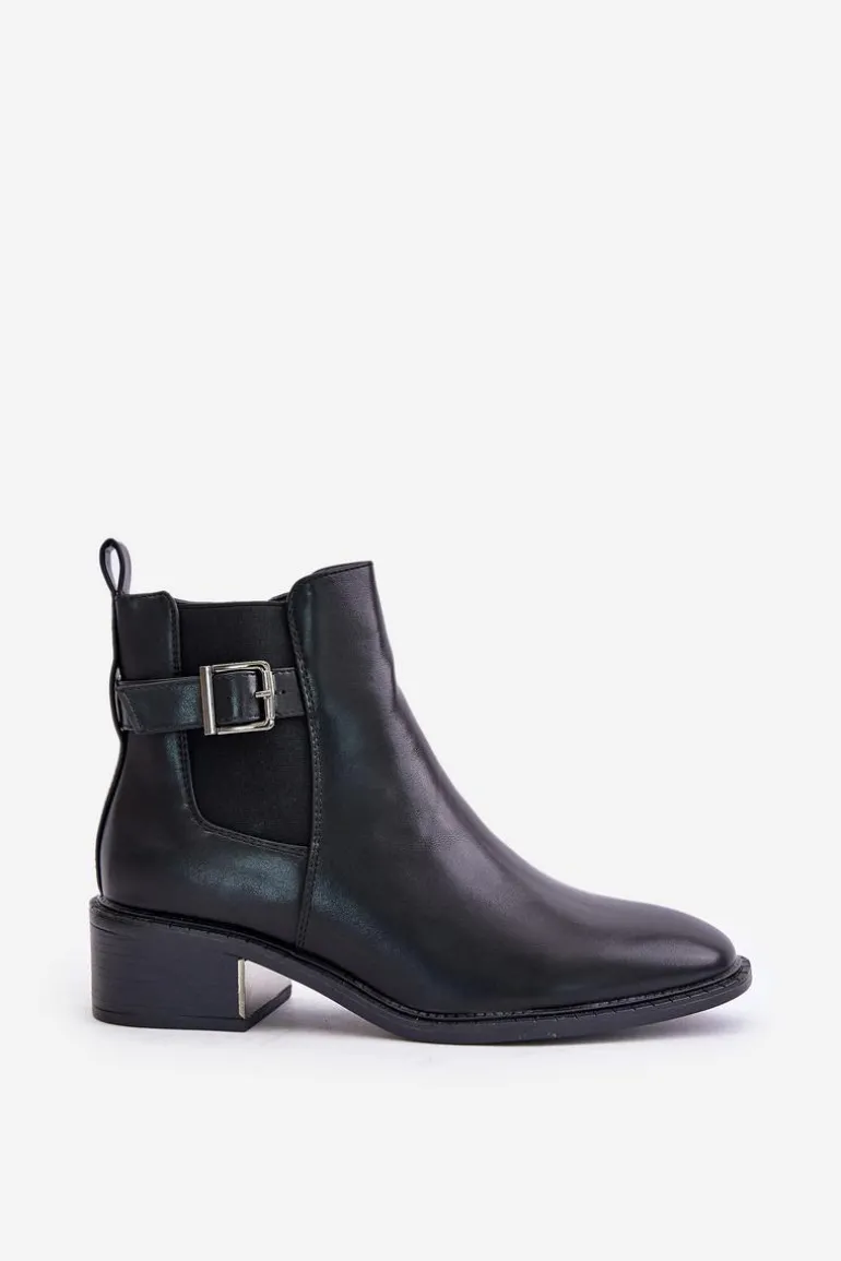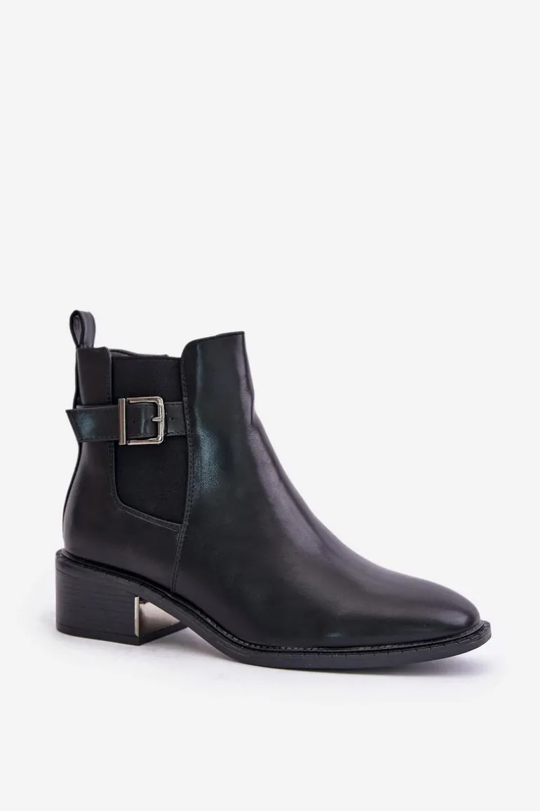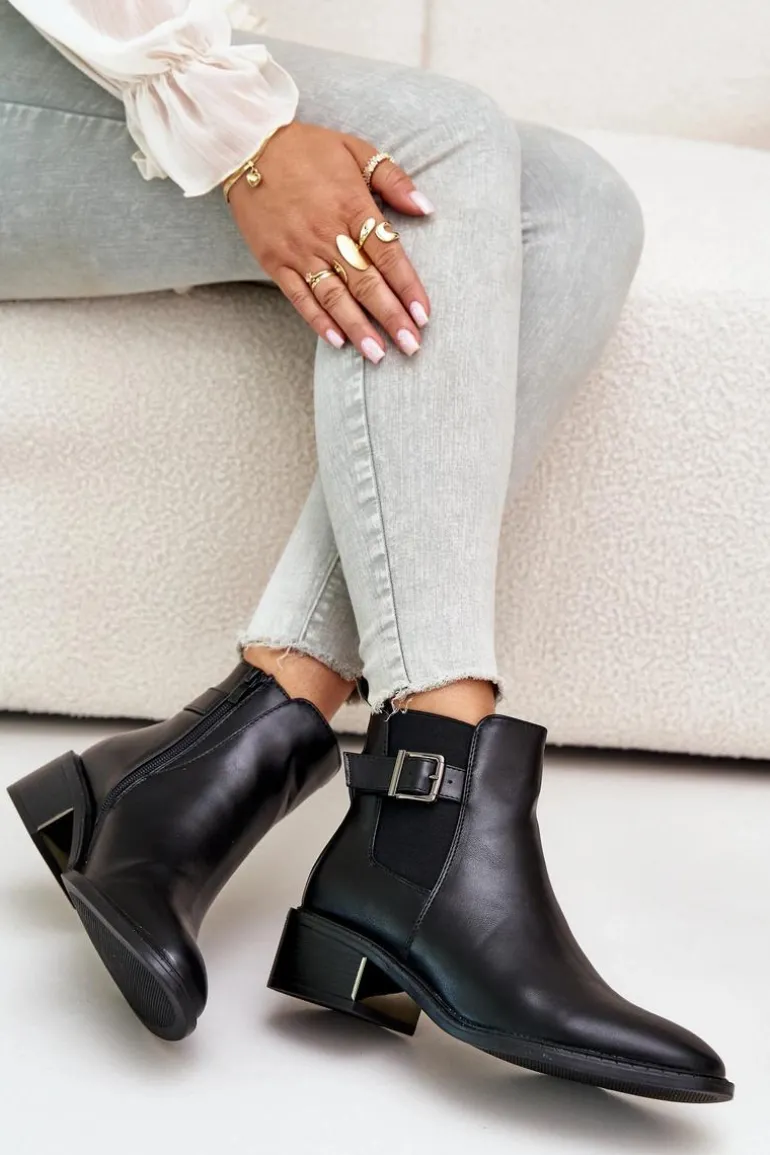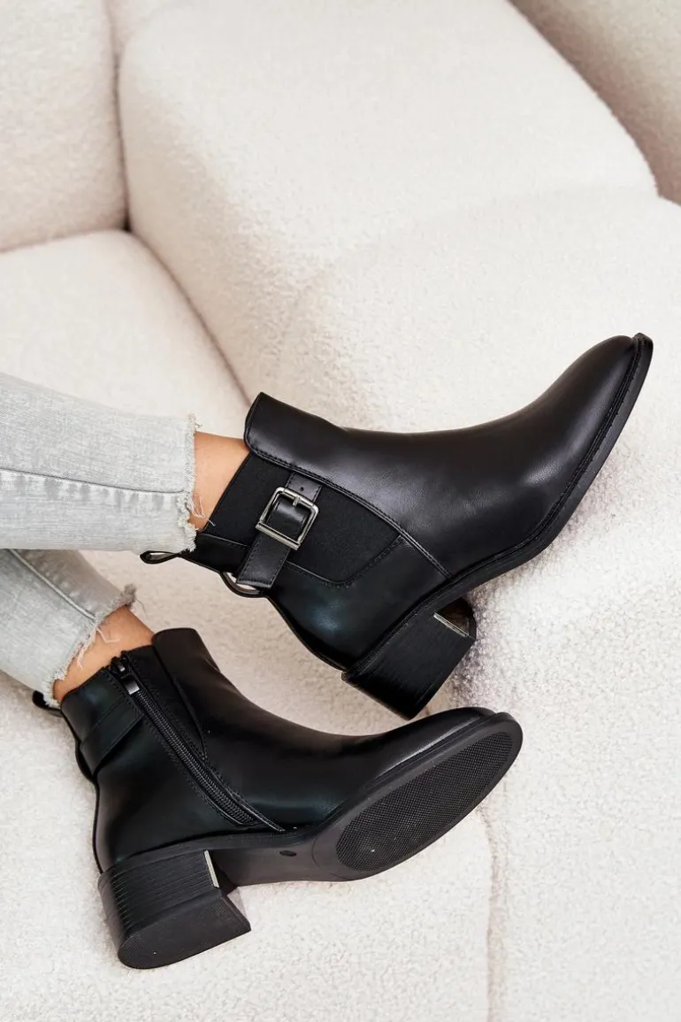 Botki damskie wykonane z eko skóry. Osadzone na niskim obcasie. Środek ocieplony kocem obuwniczym, co zapewni ciepło w chłodniejsze dni. Noski zaokrąglone. Zapinane na zamek. Na cholewce pasek ze złotą klamrą. Klasyczny fason sprawia, że możesz dopasować je do wielu stylizacji! Przy wyborze rozmiaru prosimy sugerować się tabelą rozmiarów.