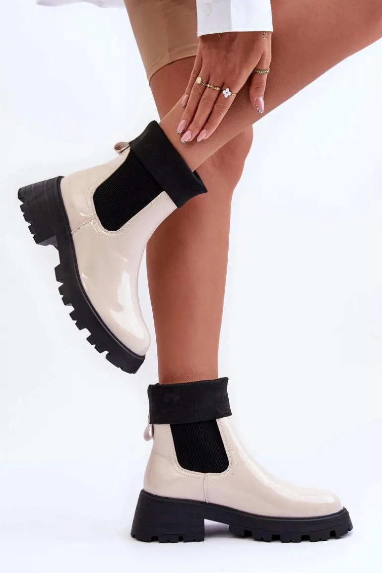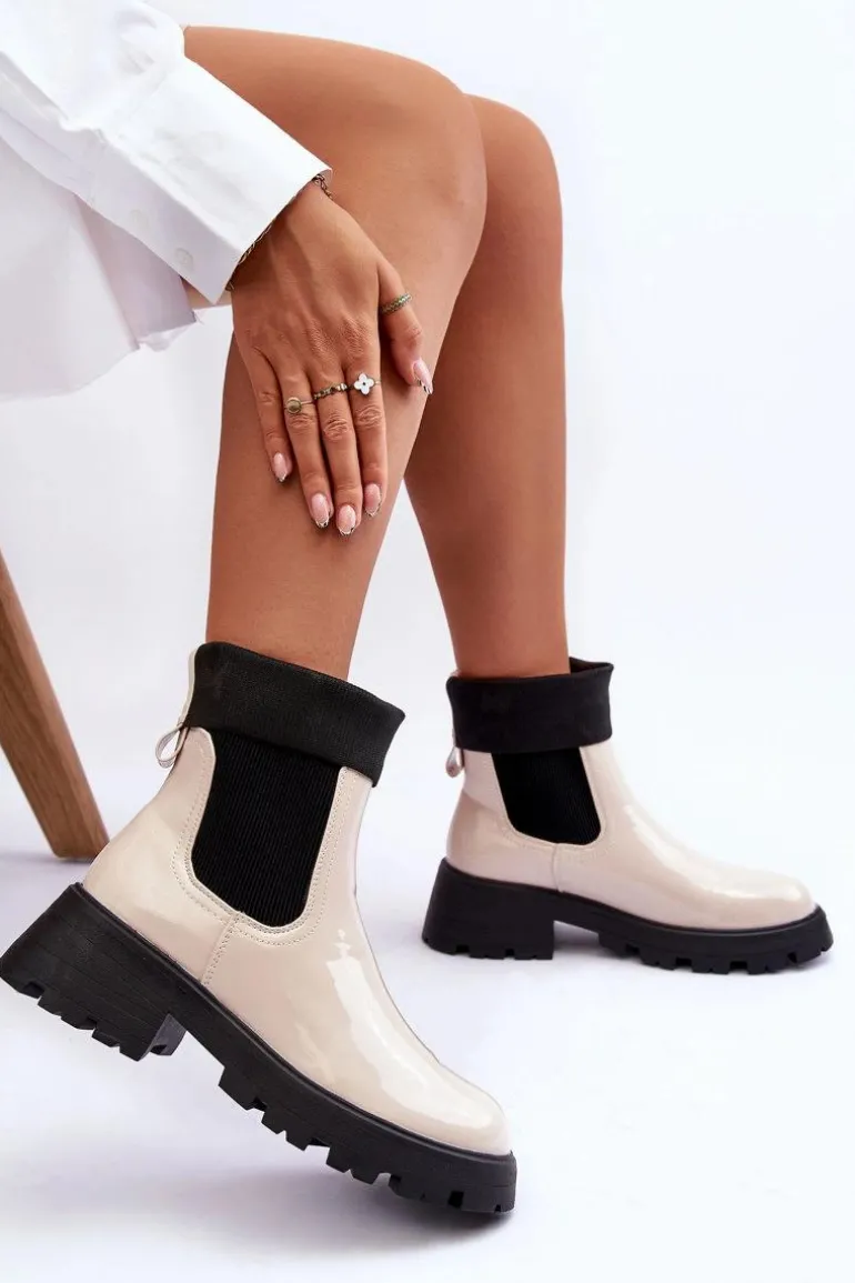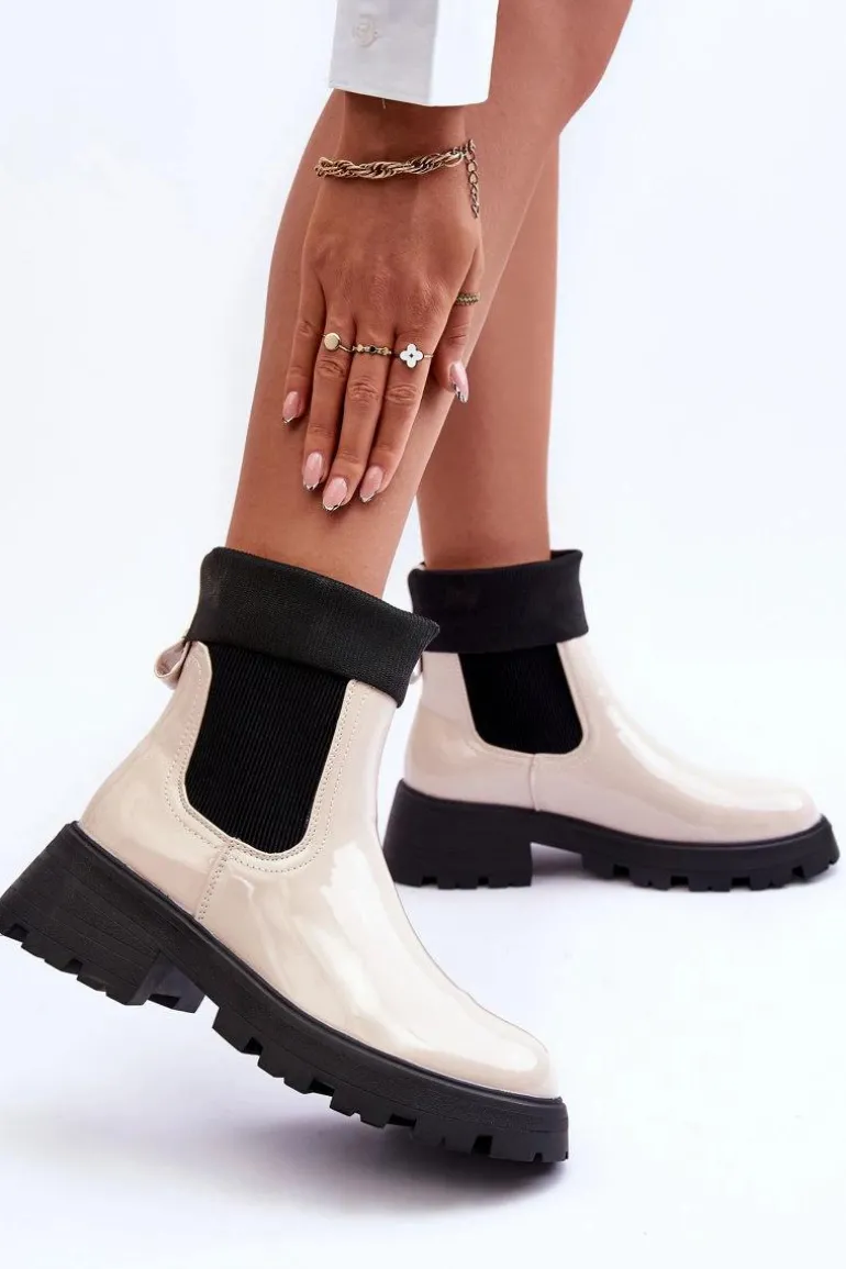 Botki Sztyblety Lakierowane Damskie Beżowe Pavo