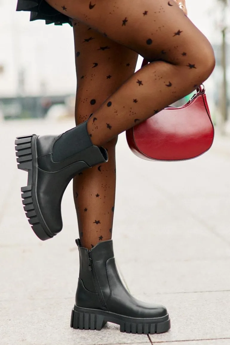 Botki wykonane z eko skóry to modny i praktyczny wybór na chłodniejsze dni. Model zapinany na zamek, osadzony na platformie i płaskim obcasie, zapewnia wygodę oraz subtelne podwyższenie. Zaokrąglone noski nadają im klasyczny wygląd, a elastyczna wstawka na cholewce ułatwia dopasowanie do nogi. Wnętrze ocieplane kocem obuwniczym gwarantuje ciepło i komfort, co czyni te botki doskonałym wyborem na co dzień. Przy wyborze rozmiaru prosimy sugerować się tabelą rozmiarów.