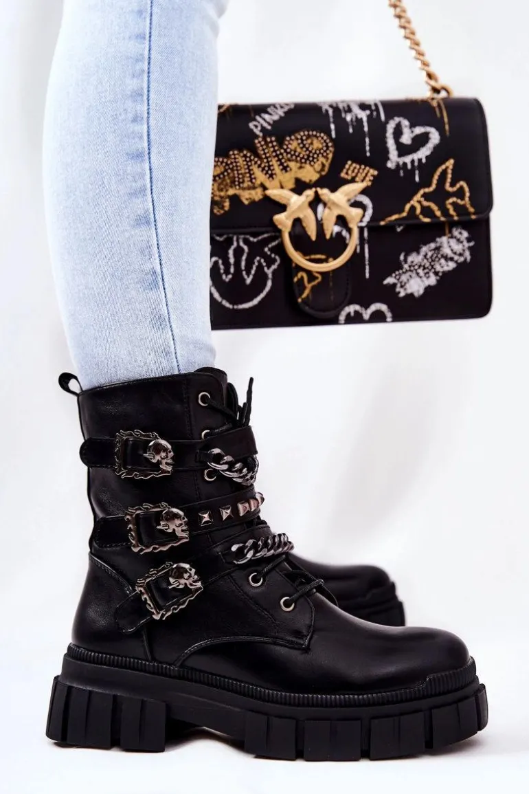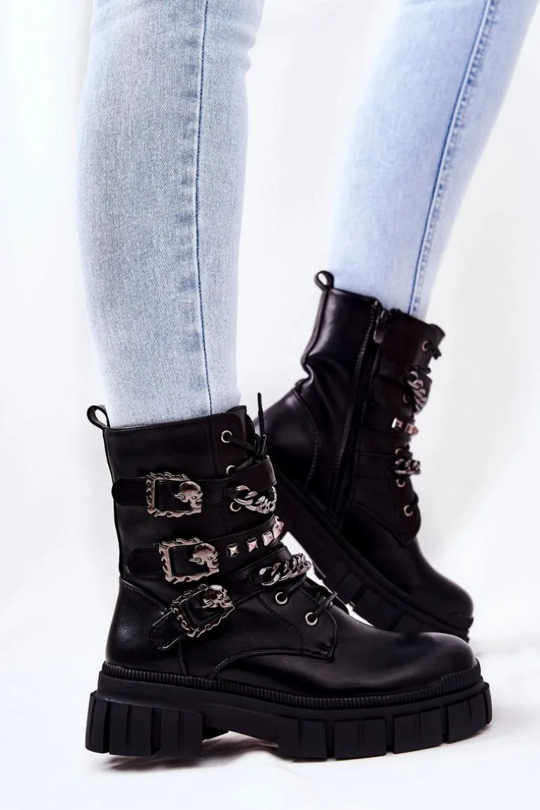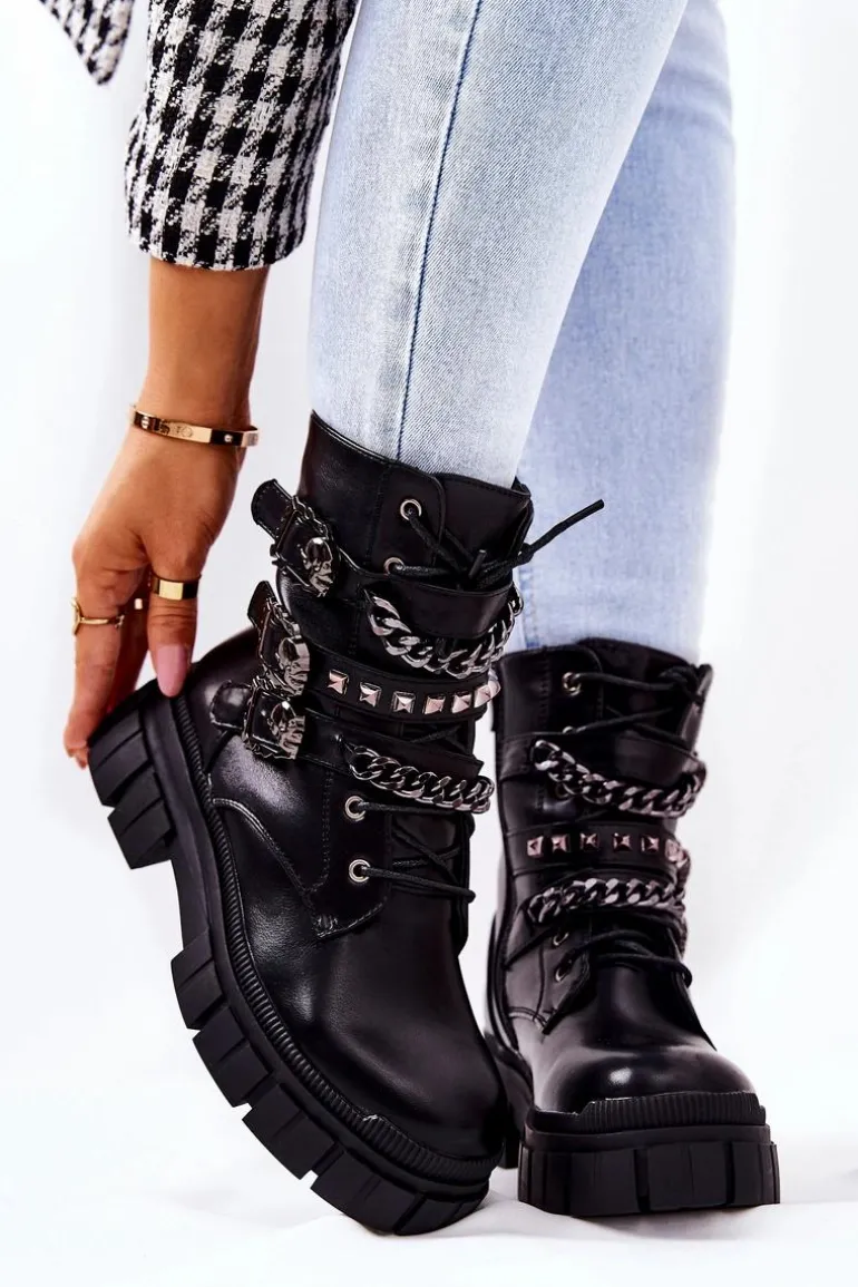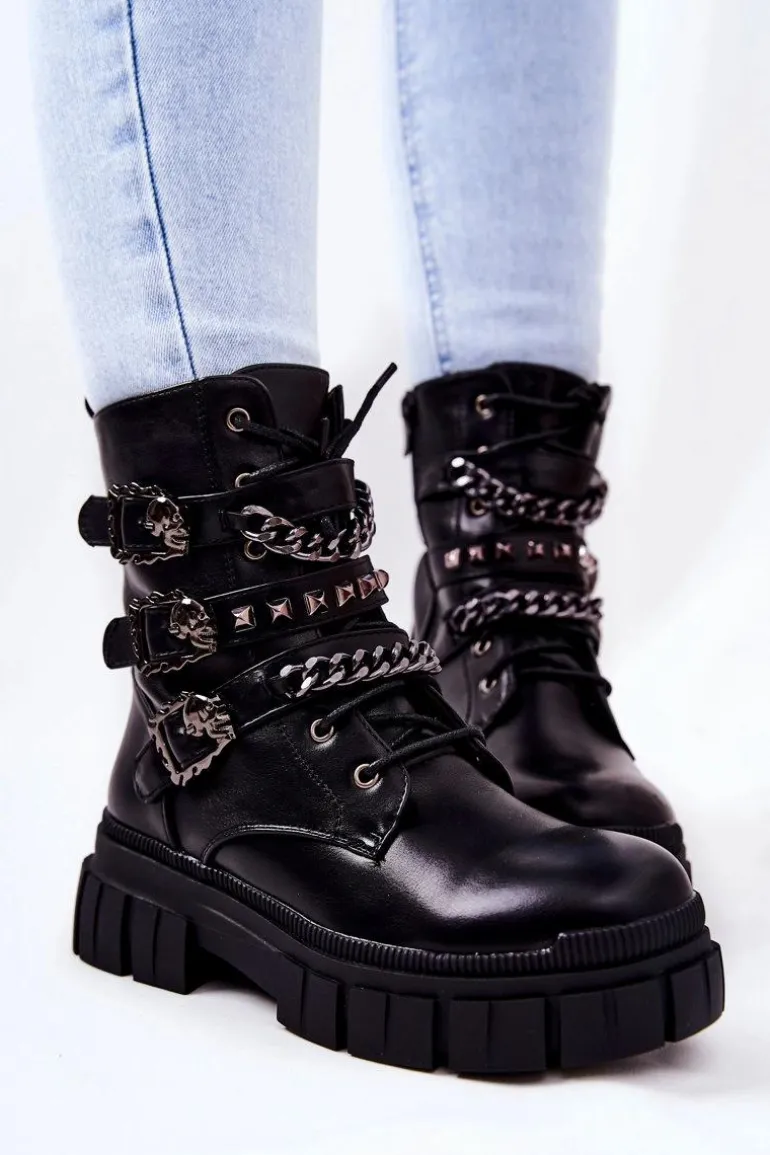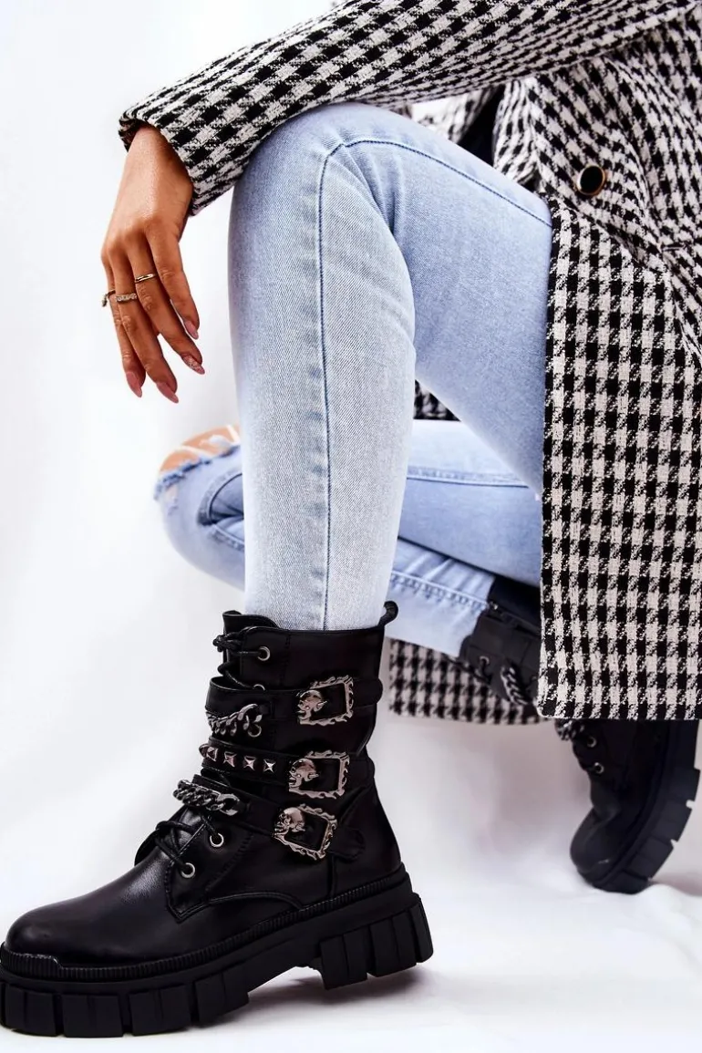 Botki Wiązane Łańcuch Sprzączka Czarne Reiloy