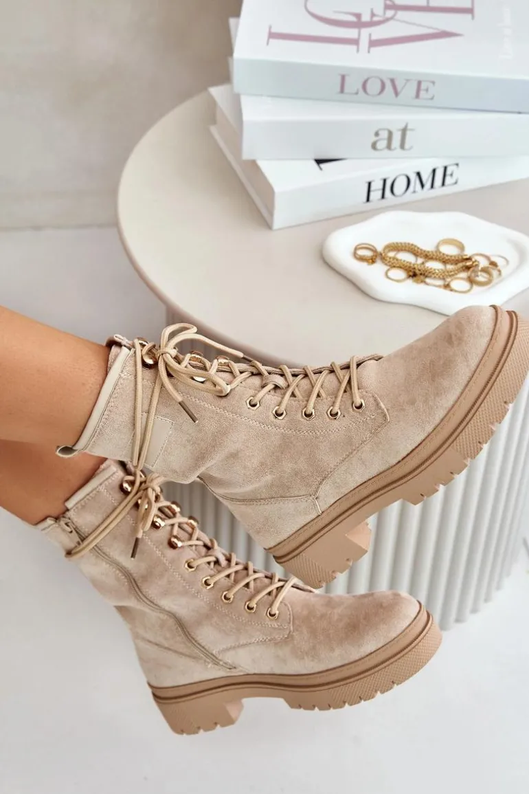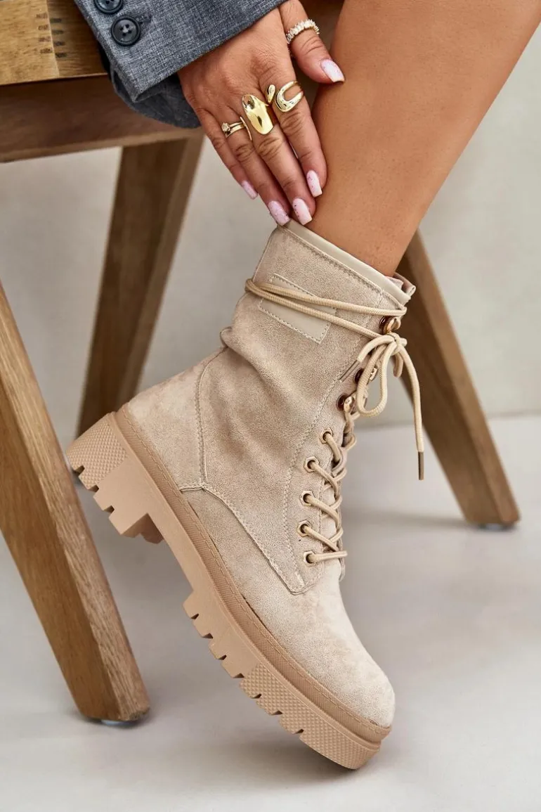 Workery damskie wykonane z eko zamszu. Osadzone na płaskim obcasie. Noski zaokrąglone. Zapinane na zamek oraz sznurowane. Klasyczny, modny fason, który dopełni wiele jesiennych stylizacji! Przy wyborze rozmiaru prosimy sugerować się tabelą rozmiarów.