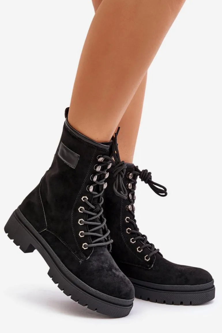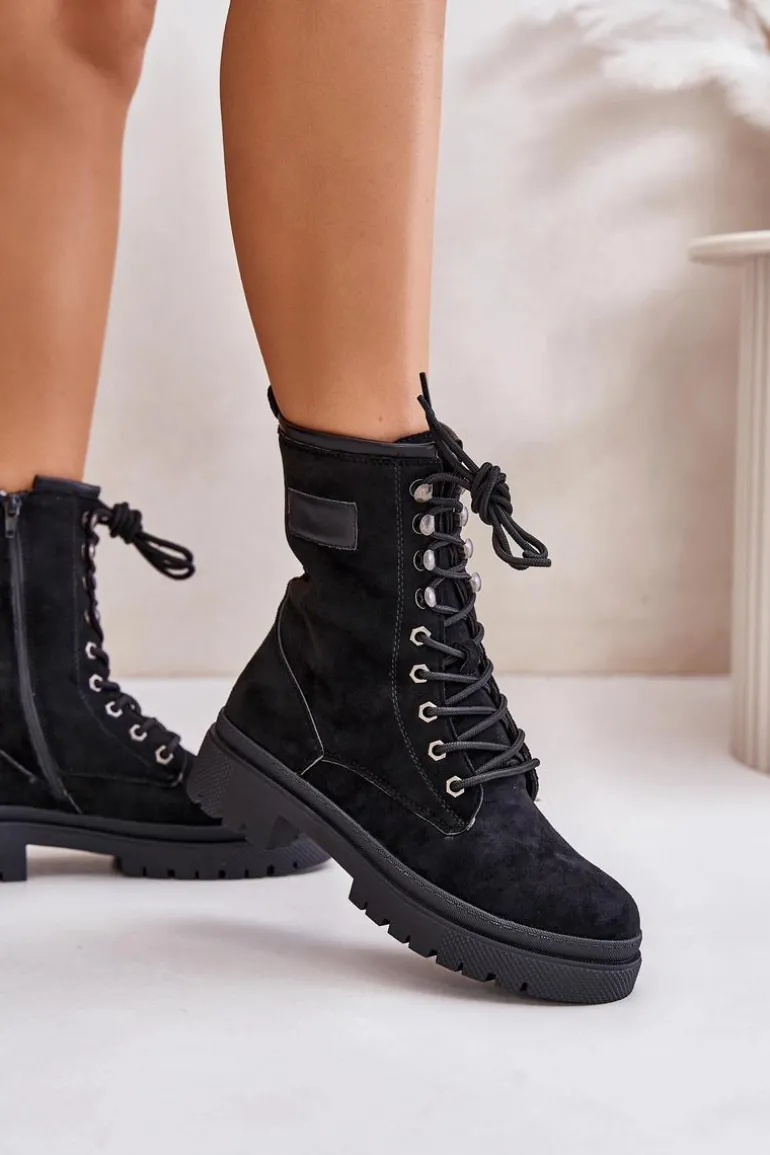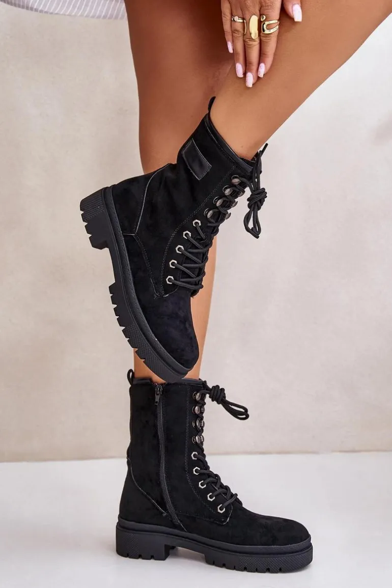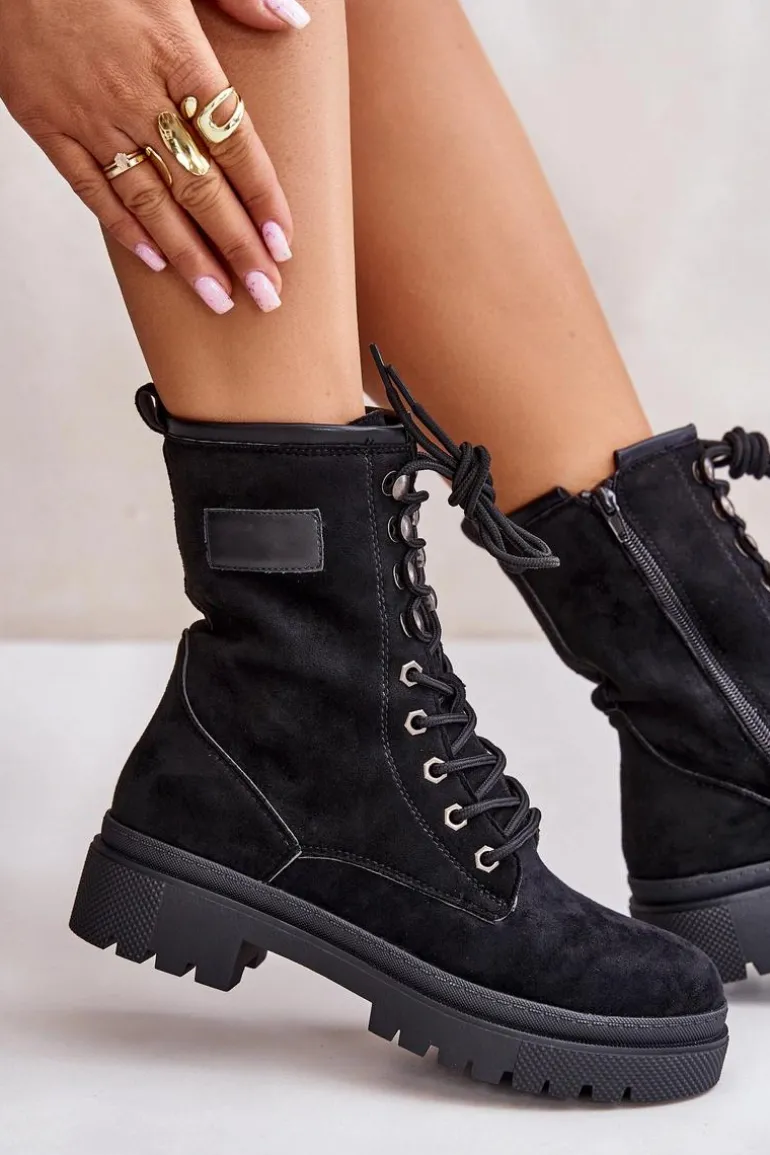 Workery damskie wykonane z eko zamszu. Osadzone na płaskim obcasie. Noski zaokrąglone. Zapinane na zamek oraz sznurowane. Klasyczny, modny fason, który dopełni wiele jesiennych stylizacji! Przy wyborze rozmiaru prosimy sugerować się tabelą rozmiarów.