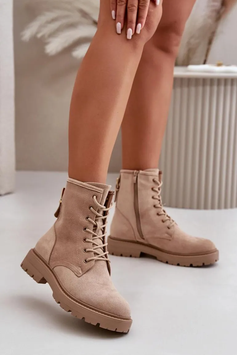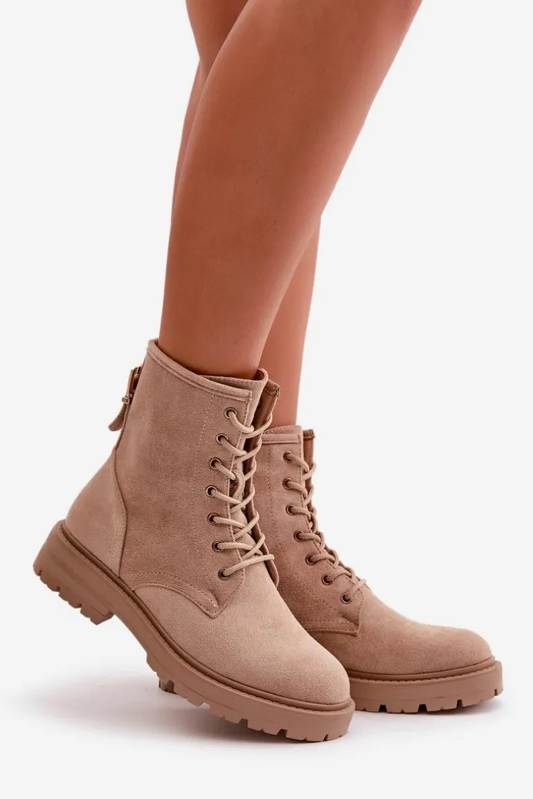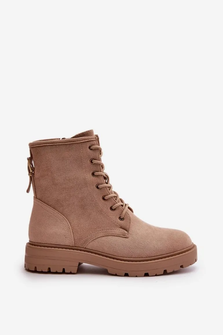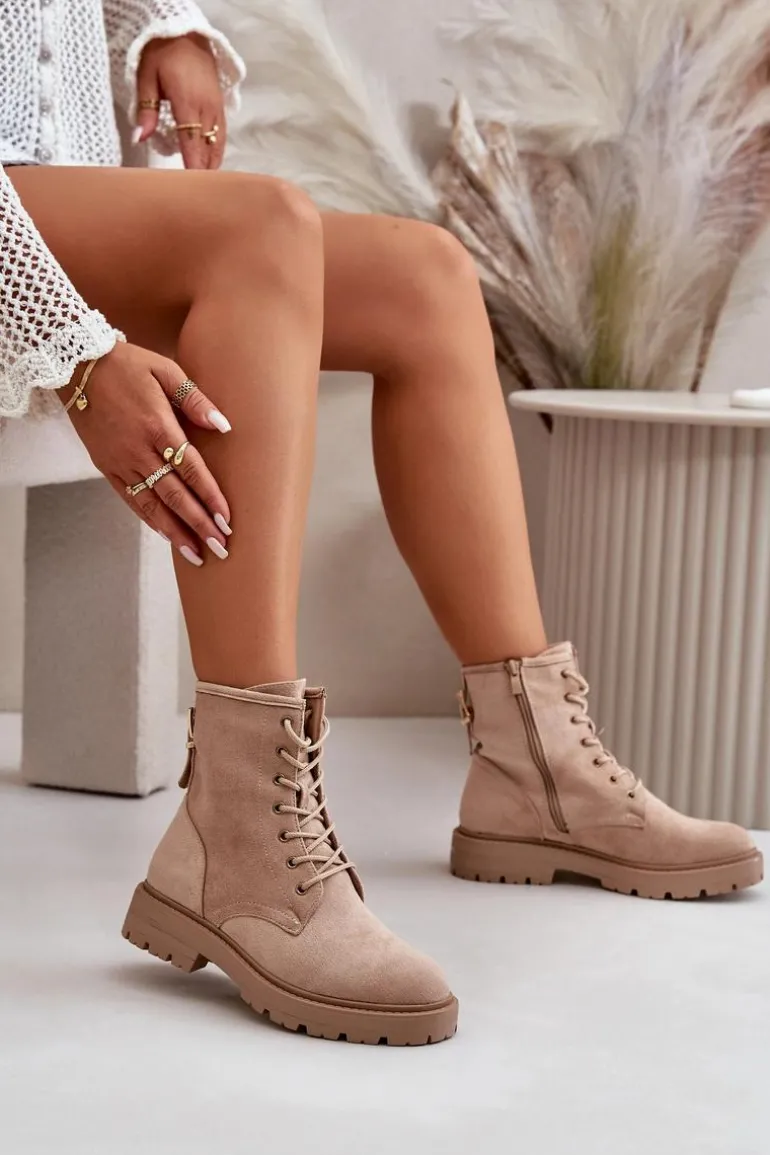 Damskie botki wykonane z miłego w dotyku eko zamszu. Środek ocieplony kocem obuwniczym, co zapewnia komfort w chłodniejsze dni. Model sznurowany, z dodatkowym zapięciem na zamek, co ułatwia zakładanie i dopasowanie do stopy. Idealne na jesienno-zimowe spacery i codzienne stylizacje. Przy wyborze rozmiaru prosimy sugerować się tabelą rozmiarów.
