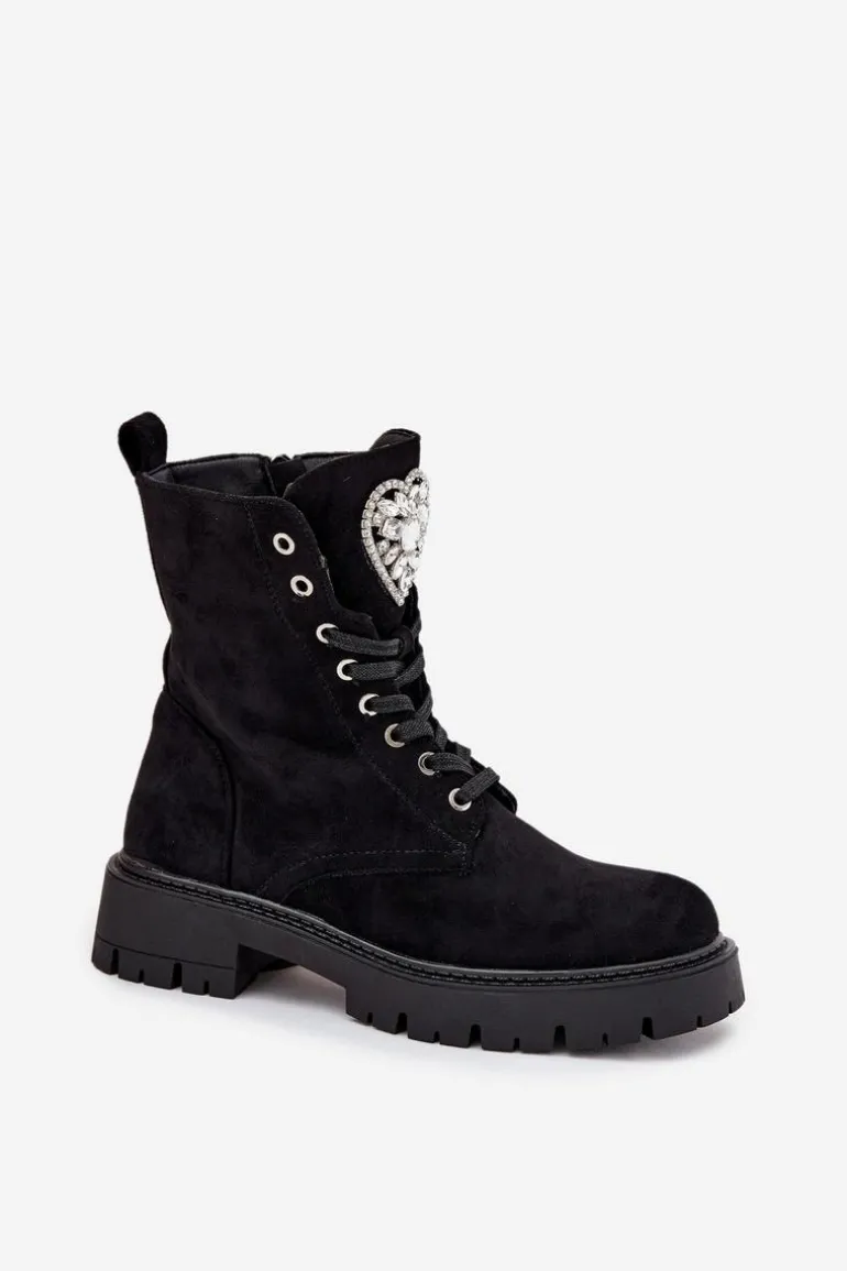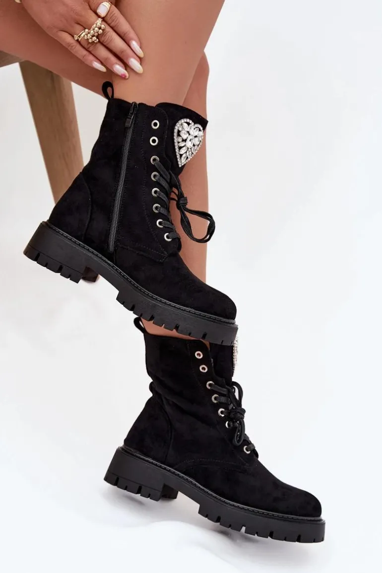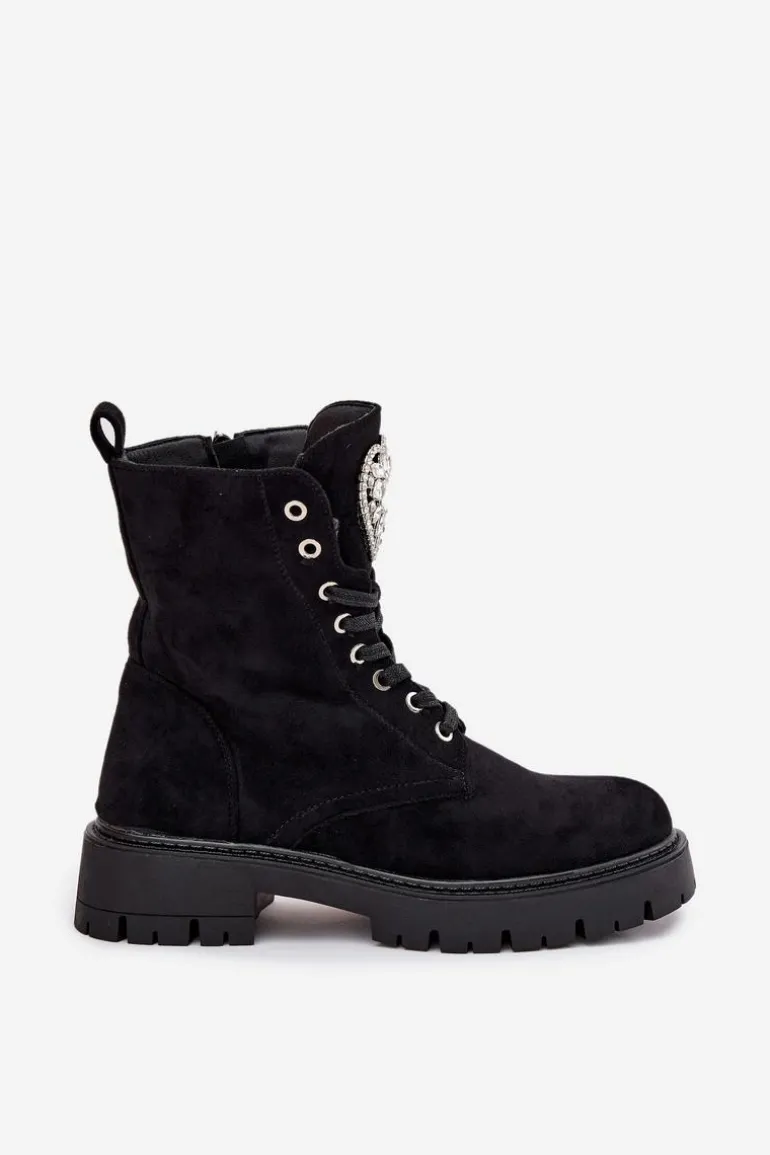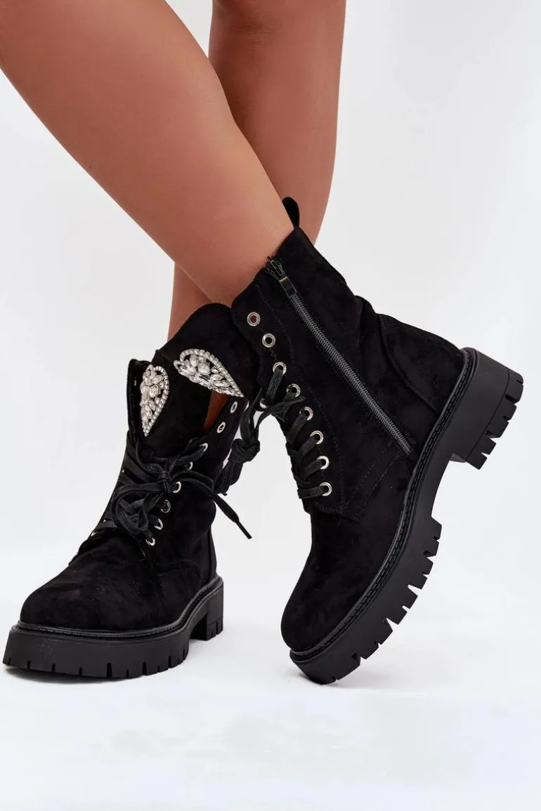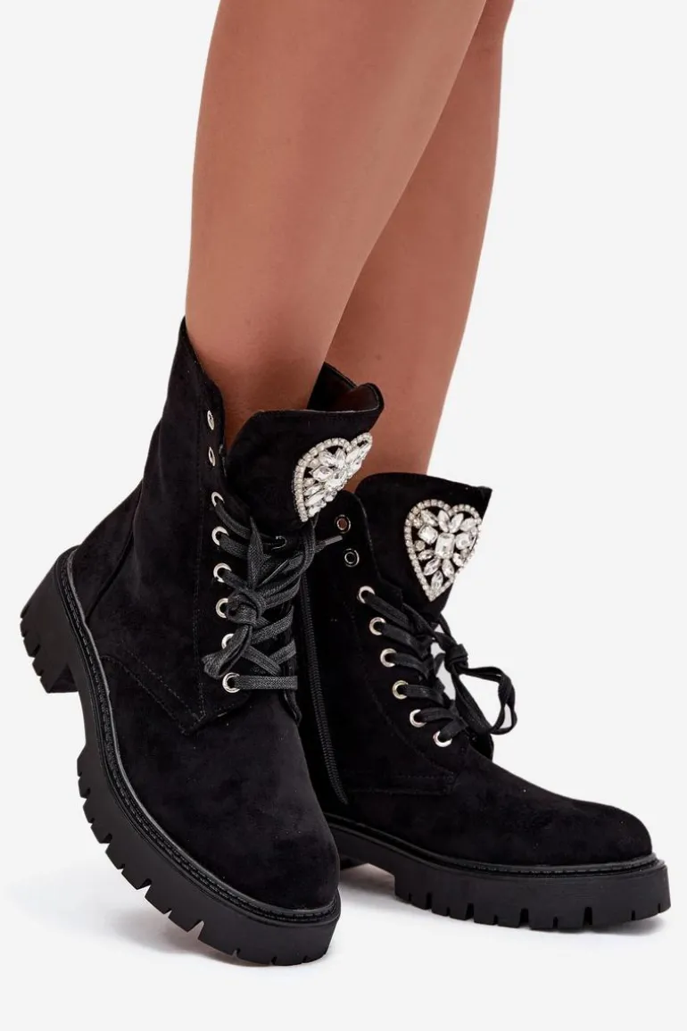 Botki damskie z eko zamszu to urocza propozycja łącząca wygodę z modnym detalem. Model sznurowany i zapinany na zamek zapewnia łatwe zakładanie i idealne dopasowanie do stopy, a ozdobne serce z kryształkami na języku dodaje subtelnego, kobiecego blasku, świetnie uzupełniając codzienne stylizacje. Przy wyborze rozmiaru prosimy sugerować się tabelą rozmiarów.