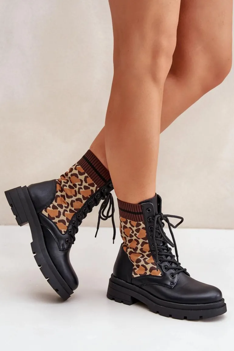 Botki damskie wykonane z połączenia eko skóry i tkaniny, ozdobione stylowym wzorem w panterkę. Model sznurowany z zaokrąglonymi noskami, co zapewnia wygodę i stabilność. Wnętrze ocieplane na wysokości stopy, idealne na chłodniejsze dni. Świetny wybór dla kobiet ceniących wygodę i modne akcenty. Przy wyborze rozmiaru prosimy sugerować się tabelą rozmiarów.