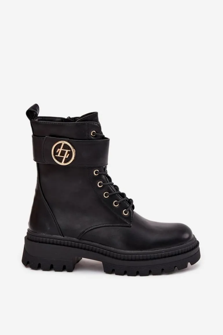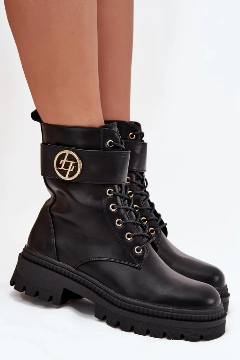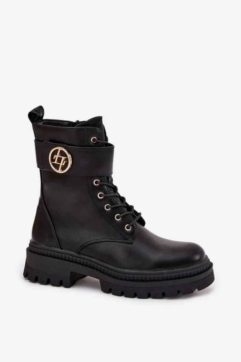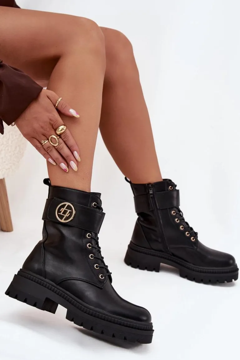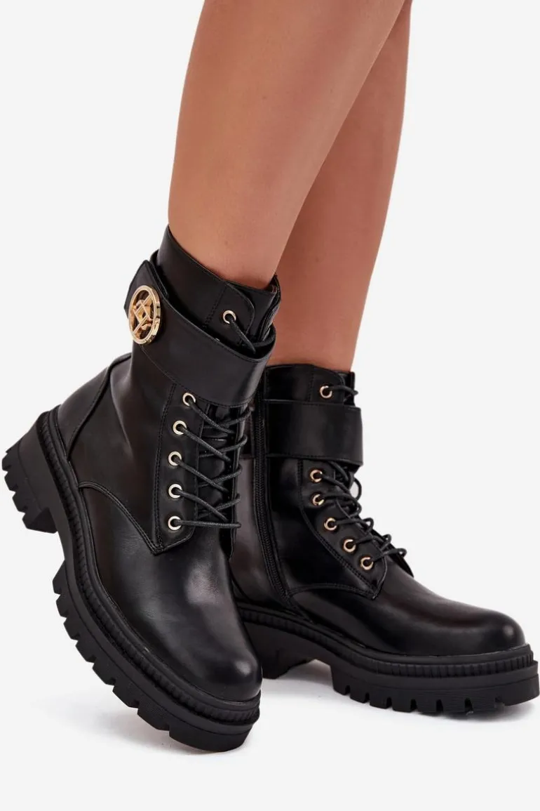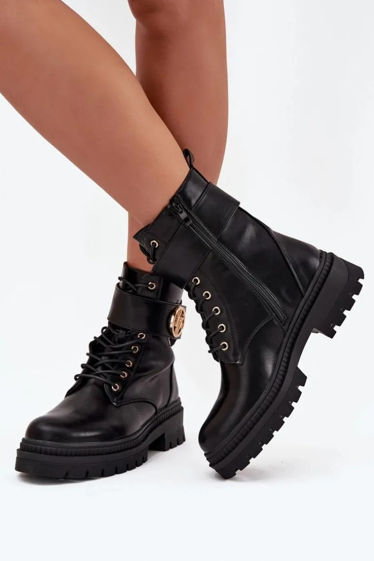Botki damskie wykonane z eko skóry. Osadzone na platformie i płaskim obcasie, zapewniają komfort i stabilność na każdym kroku. Model zapinany na zamek i sznurowany pozwala na idealne dopasowanie do stopy. Z boku cholewki, na pasku znajduje się ozdobny złoty detal. Środek ocieplony futerkiem gwarantuje ciepło, sprawiając, że te botki będą doskonałym wyborem do zimowych stylizacji. Przy wyborze rozmiaru prosimy sugerować się tabelą rozmiarów.