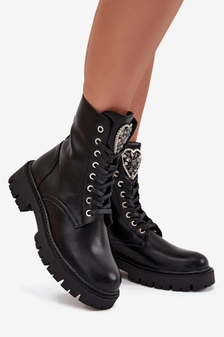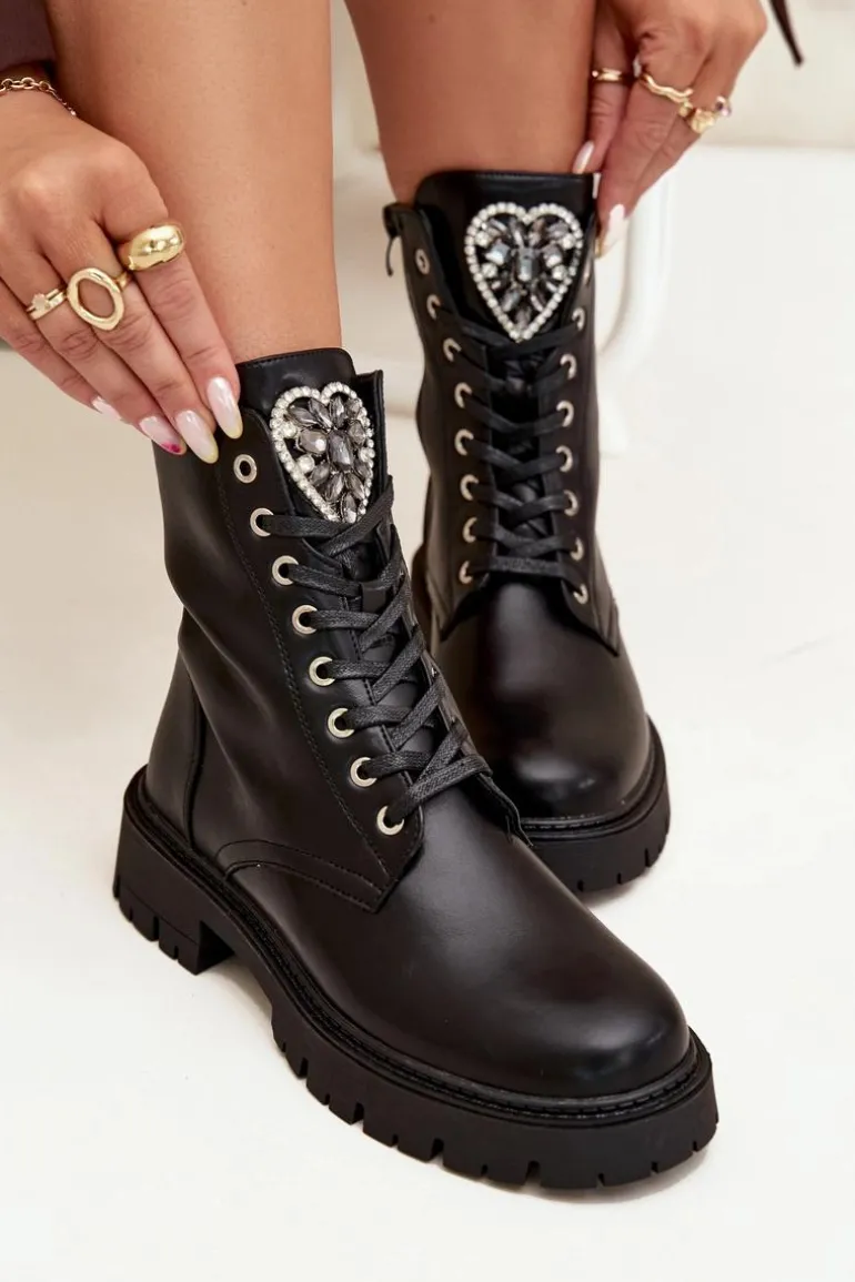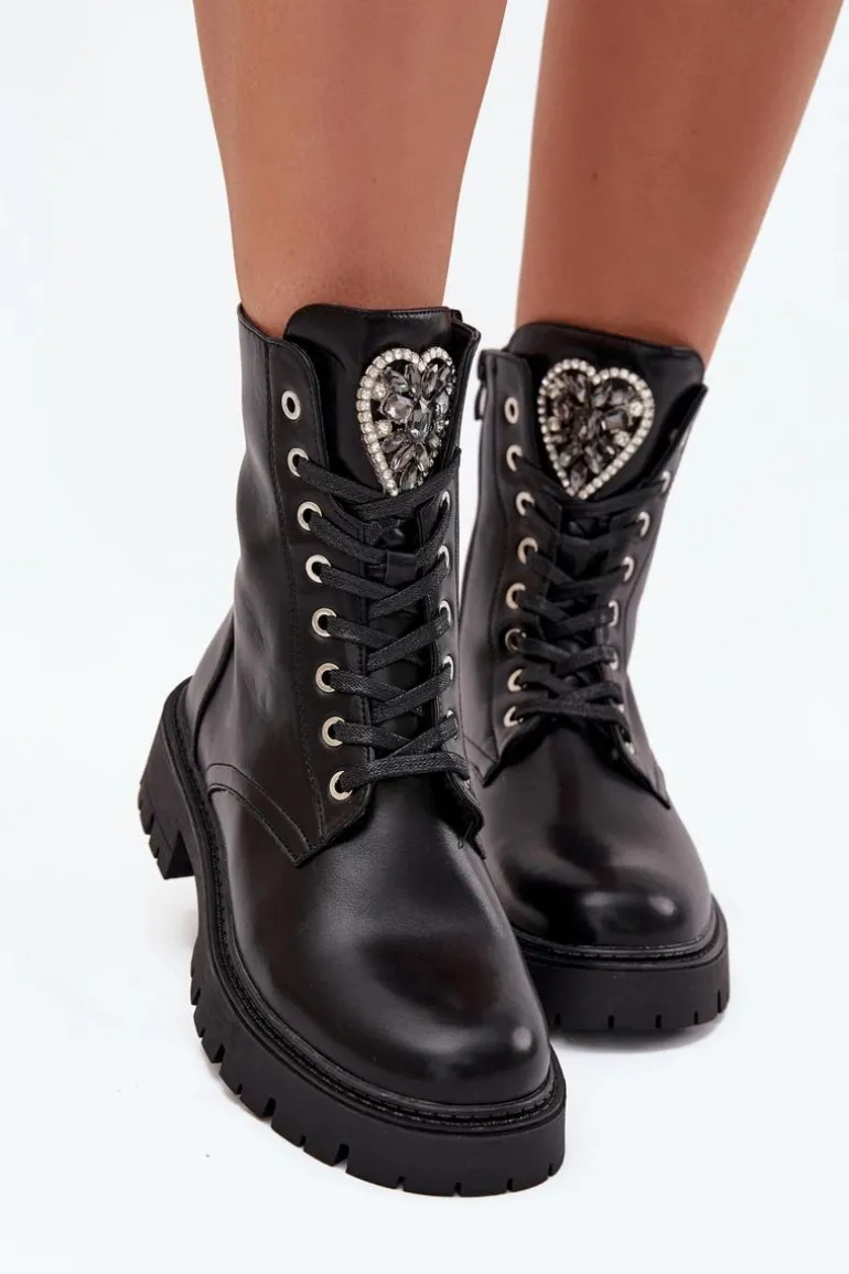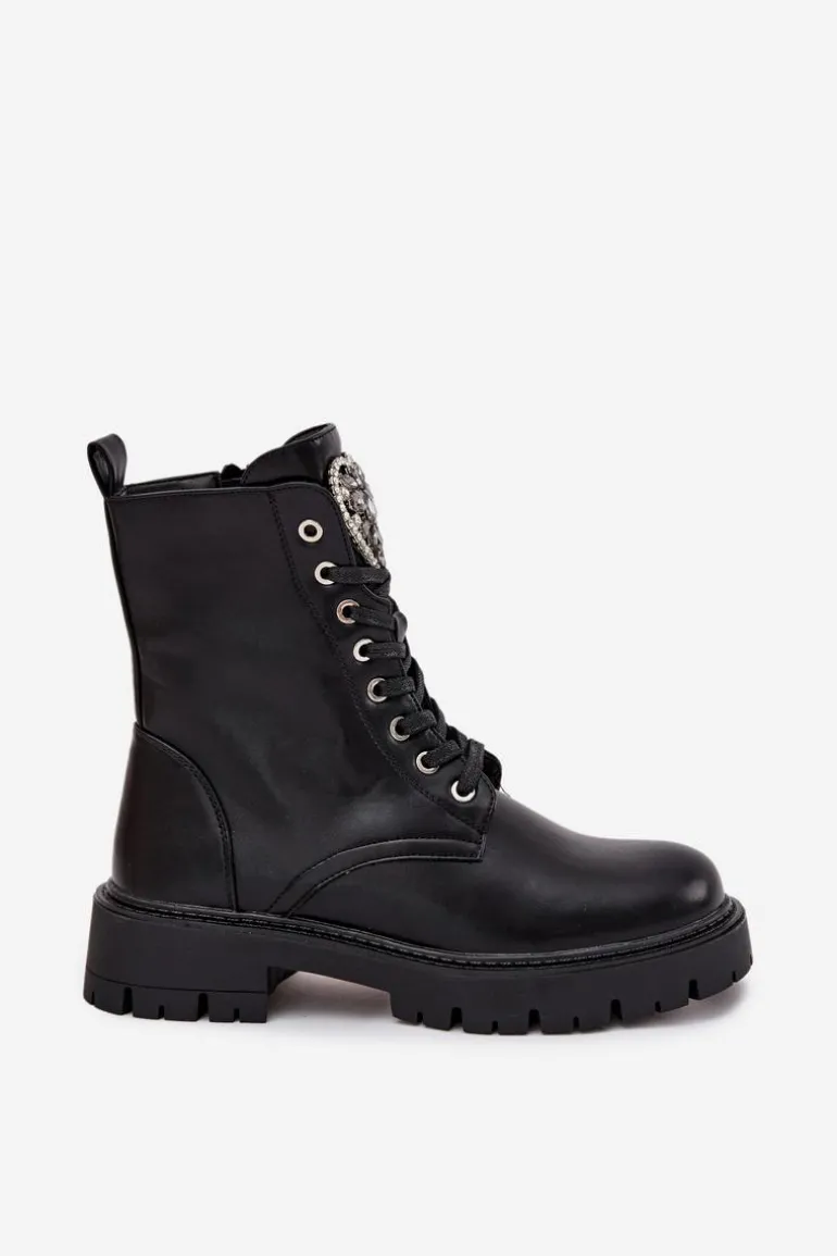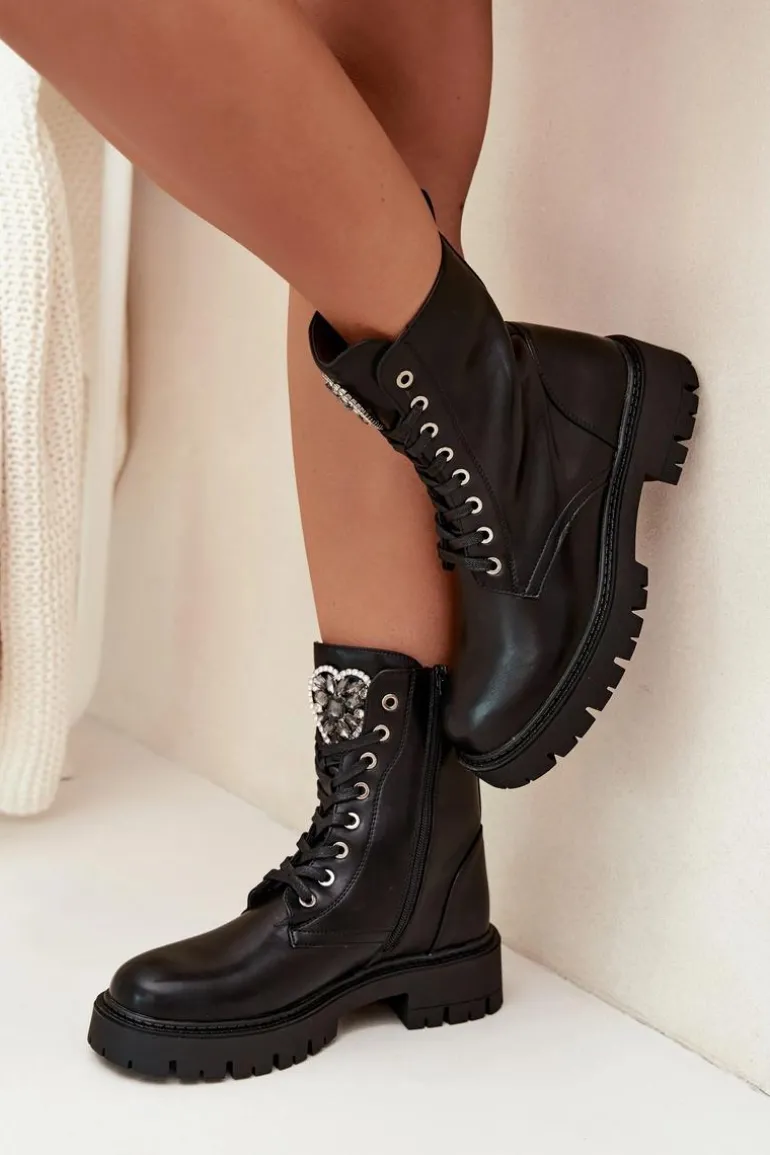 Botki Workery Z Biżuteryjną Ozdobą Ocieplane Eko Skórzane Czarne Miryssa
