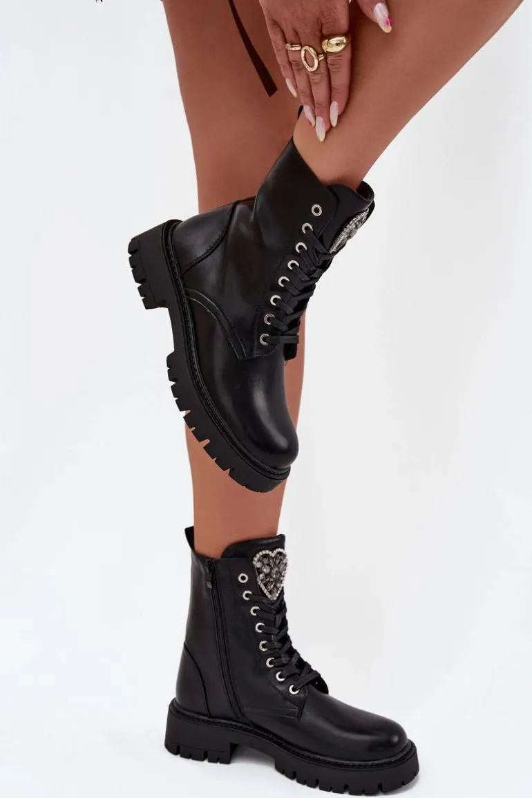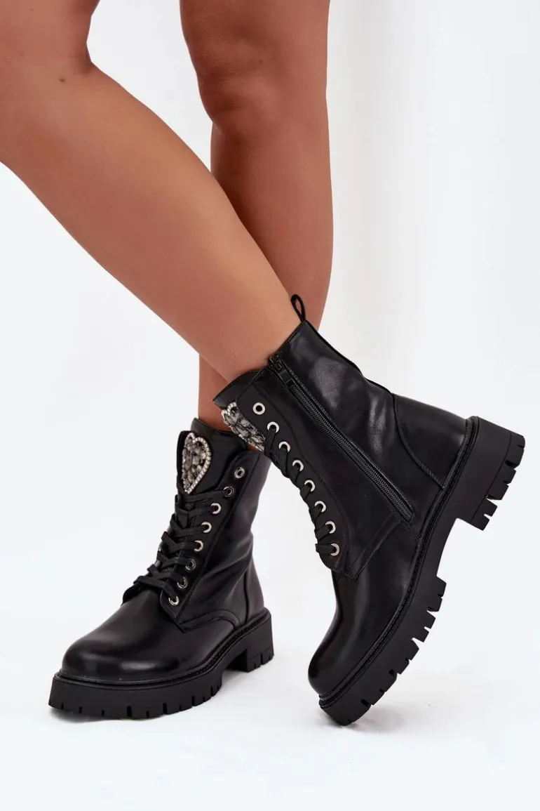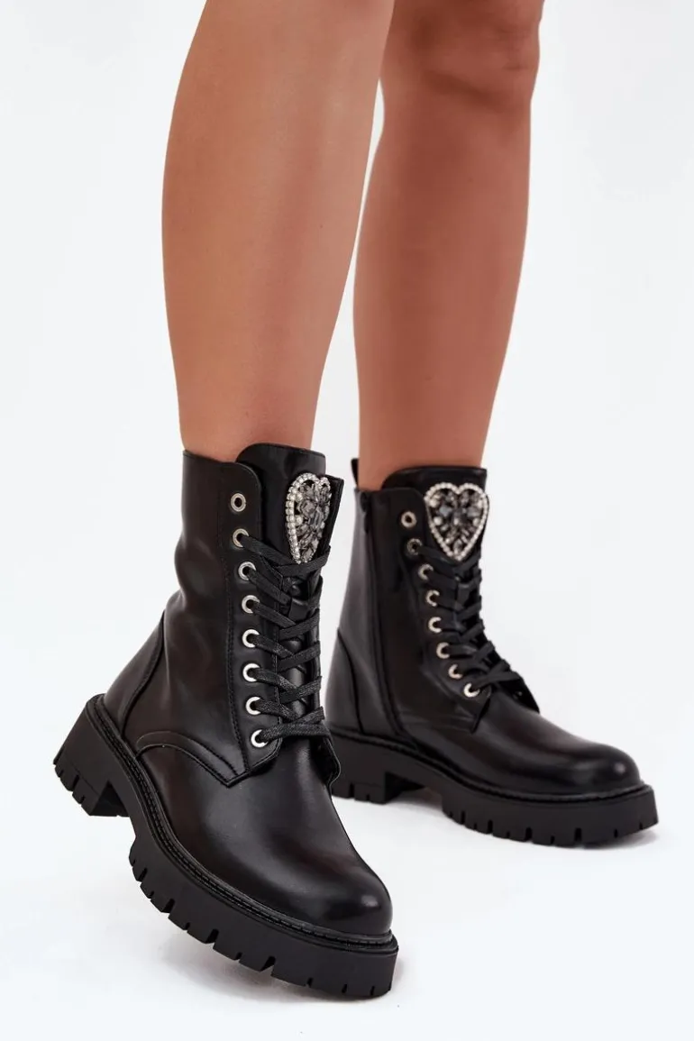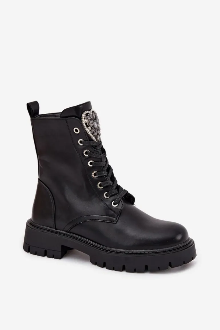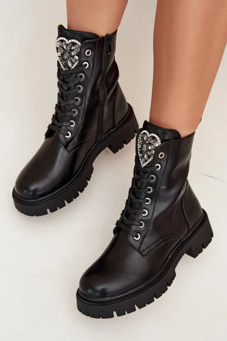 Botki Workery Z Biżuteryjną Ozdobą Ocieplane Eko Skórzane Czarne Miryssa