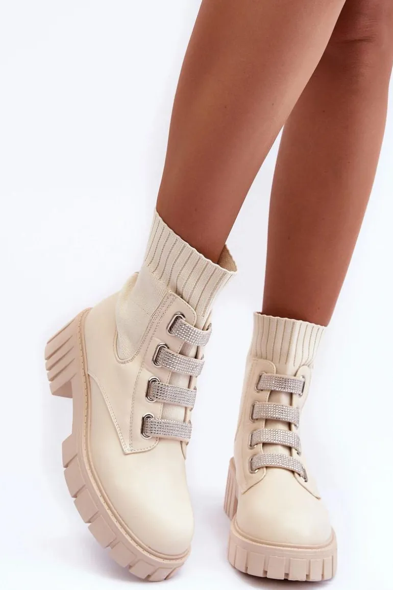 Botki damskie osadzone na płaskim obcasie i platformie. Wykonane z połączenia eko skóry i tkaniny. Z przodu znajdują się ozdobione małymi dżetami paski. Model wsuwany z elastyczną cholewką w formie skarpety. Ocieplenie kocem obuwniczym na wysokości stopy. Idealne do jesiennych stylizacji! Przy wyborze rozmiaru prosimy sugerować się tabelą rozmiarów.