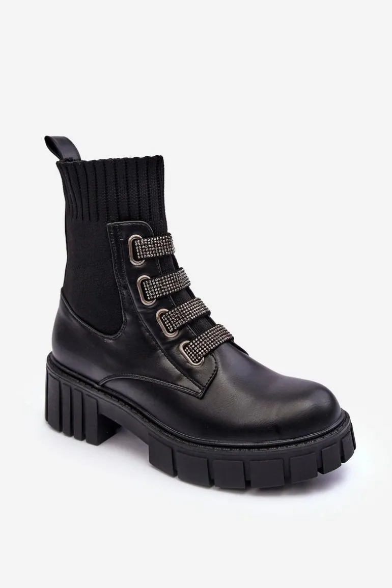 Botki damskie osadzone na płaskim obcasie i platformie. Wykonane z połączenia eko skóry i tkaniny. Z przodu znajdują się ozdobione małymi dżetami paski. Model wsuwany z elastyczną cholewką w formie skarpety. Ocieplenie kocem obuwniczym na wysokości stopy. Idealne do jesiennych stylizacji! Przy wyborze rozmiaru prosimy sugerować się tabelą rozmiarów.