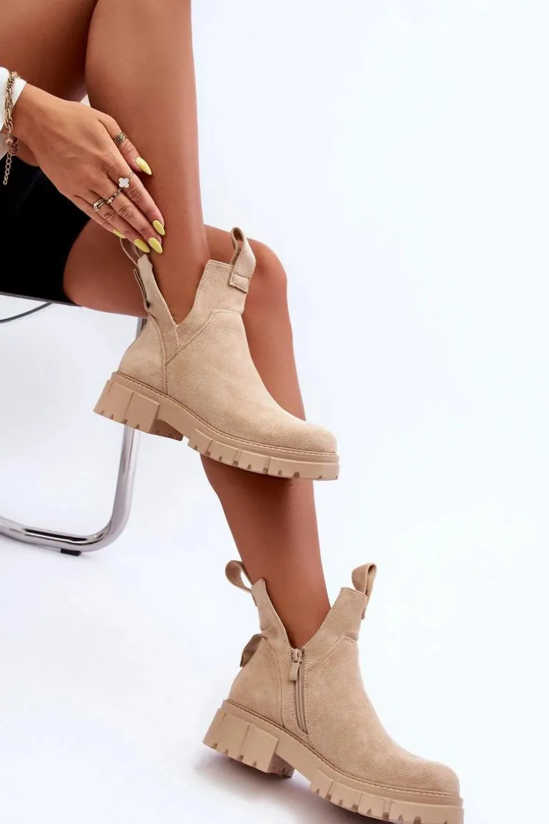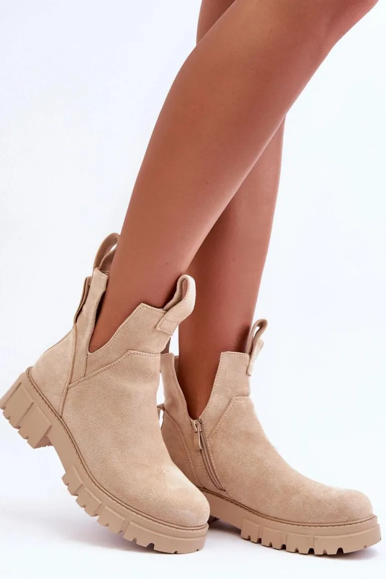Ten model wygląda niezwykle modnie i stylowo! Damskie botki zostały wykonane z eko zamszu z wycięciami po bokach cholewki. Osadzono je na masywnej platformie i płaskim obcasie. Model ten posiada zaokrąglony nosek. Środek nie jest ocieplany. Botki są zapinane z boku na suwak. Nie czekaj aż znikną i kup już dziś! Przy wyborze rozmiaru prosimy sugerować się tabelą rozmiarów.
