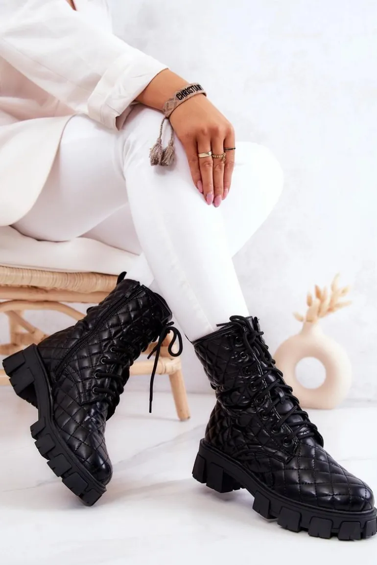Botki świetnie sprawdzą się podczas tworzenia stylizacji w chłodniejsze dni. Pikowany materiał ze skóry ekologicznej to totalny must have w Twojej garderobie. Idealne do zwiewnych sukienek oraz spodni. Posiadają wiązanie oraz suwak. Dodatkowo do buta jest dołączona nerka zapinana na suwak na regulowanym pasku. Buty są ocieplane kocem obuwniczym. Przy wyborze rozmiaru prosimy sugerować się tabelą rozmiarów.