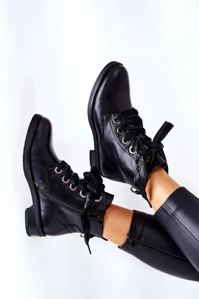 Botki wykonane ze skóry ekologicznej. Posiadają suwak oraz przyozdobione wiązanie, co ułatwi zakładanie. Ocieplane przyjemnym w dotyku kocem obuwniczym. Dzięki płaskiemu obcasowi, komfort noszenia jest jeszcze większy. Koniecznie sprawdź naszą całą kolekcje! Przy wyborze rozmiaru prosimy sugerować się tabelą rozmiarów.
