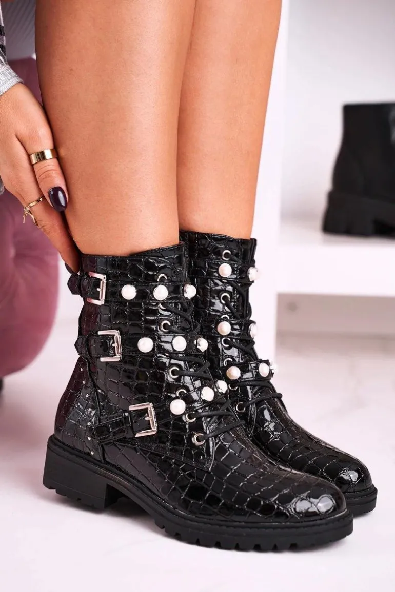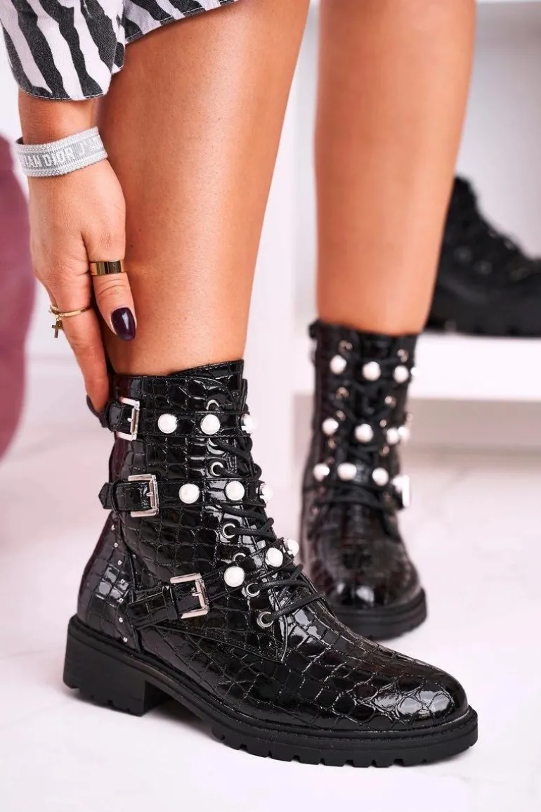 Botki Z Perełkami Lakierowane Czarne Motyw Zwierzęcy Whitney